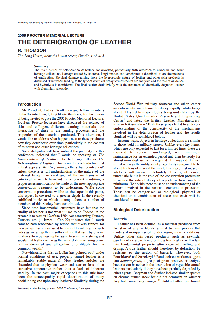The main causes of deterioration of leather are reviewed, particularly with reference to museums and other heritage collections. Damage caused by bacteria, fungi, insects and vertebrates is described, as are the methods of eradication. Physical damage arising from the hygroscopic nature of leather and other skin products is discussed. The factors leading to the type of chemical decay termed red rot are analysed and the role of oxidation and hydrolysis is considered. The final section deals briefly with the treatment of chemically degraded leather with aluminium alkoxide.