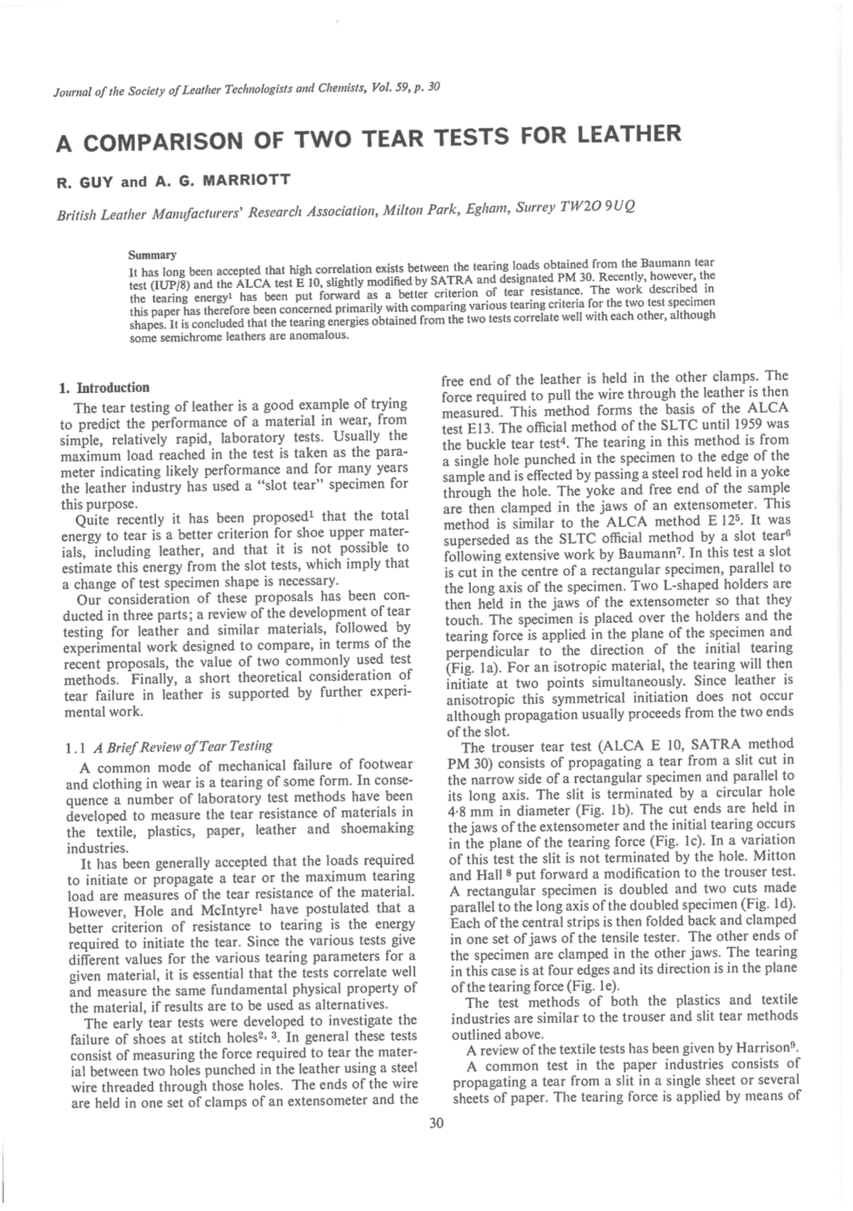 It has long been accepted that high correlation exists between the tearing loads obtained from the Baumann tear test (TIJP/8) and the ALCA test E 10, slightly modified by SATRA and designated PM 30. Recently, however, the tearing energy has been put forward as a better criterion of tear resistance. The work described in this paper has therefore been concerned primarily with comparing various tearing criteria for the two test specimen shapes. It is concluded that the tearing energies obtained from the two tests correlate well with each other, although some semichrome leathers are anomalous.