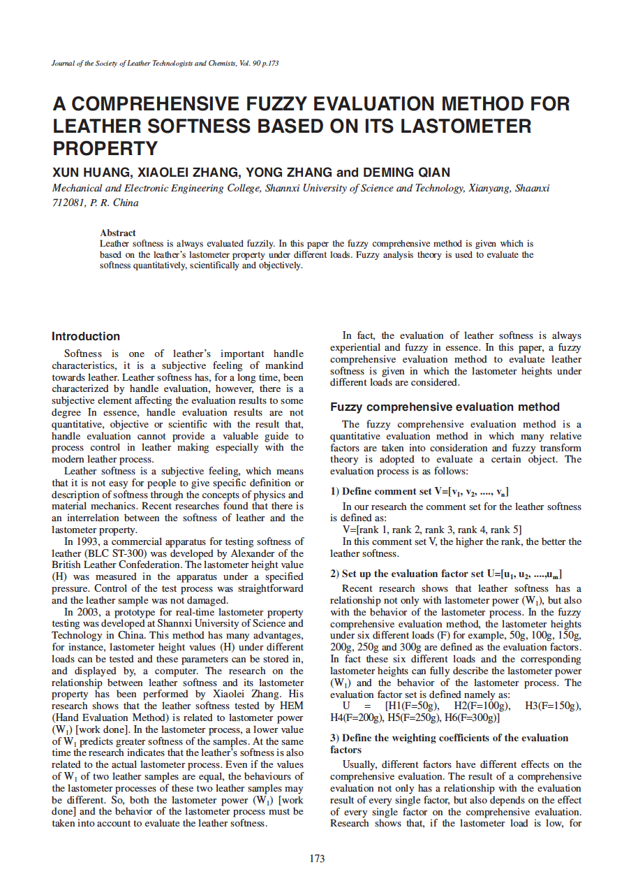 Leather softness is always evaluated fuzzily. In this paper the fuzzy comprehensive method is given which is based on the leather’s lastometer property under different loads. Fuzzy analysis theory is used to evaluate the softness quantitatively, scientifically and objectively.
