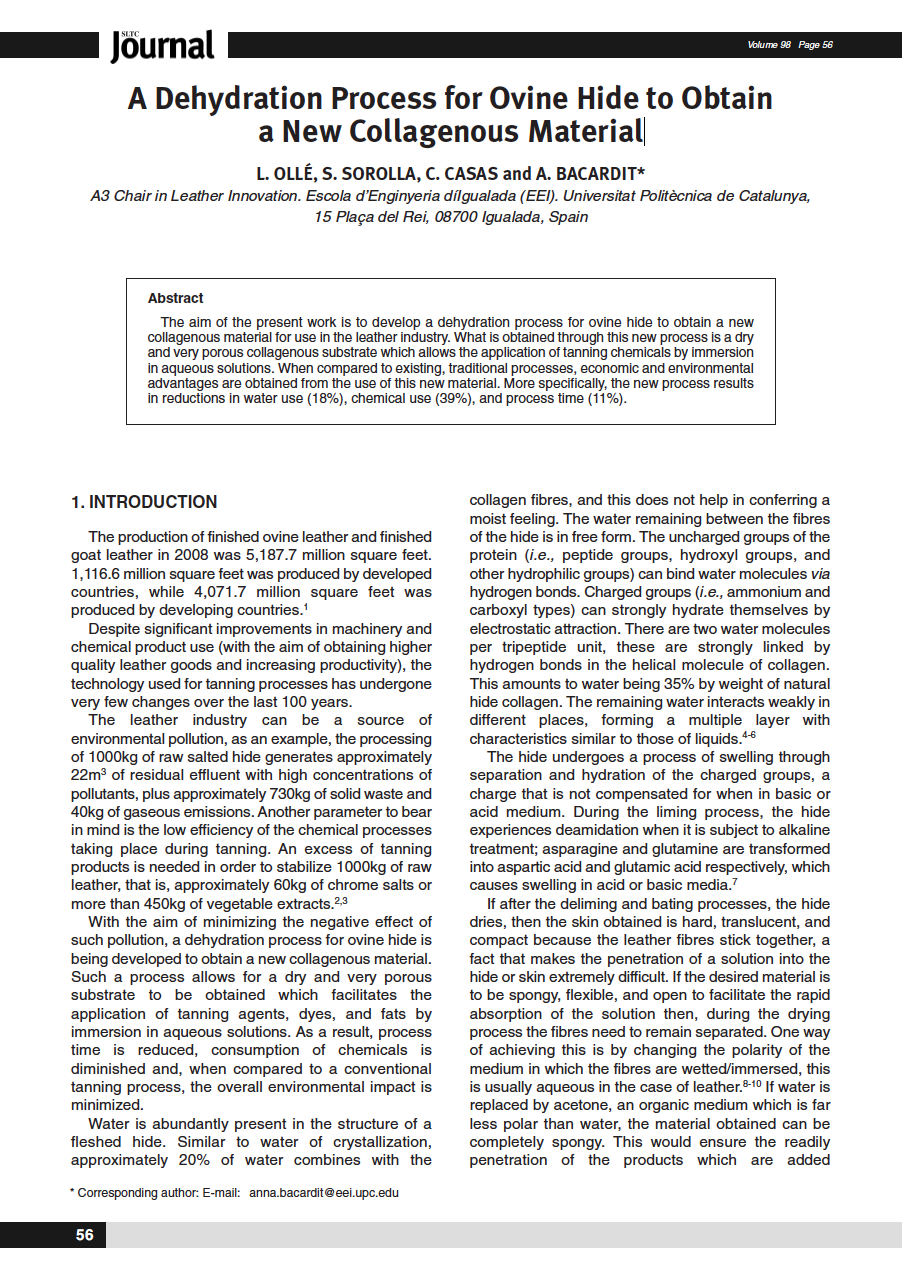The aim of the present work is to develop a dehydration process for ovine hide to obtain a new collagenous material for use in the leather industry.What is obtained through this new process is a dry and very porous collagenous substrate which allows the application of tanning chemicals by immersion in aqueous solutions.When compared to existing, traditional processes, economic and environmental advantages are obtained from the use of this new material. More specifically, the new process results in reductions in water use (18%), chemical use (39%), and process time (11%).