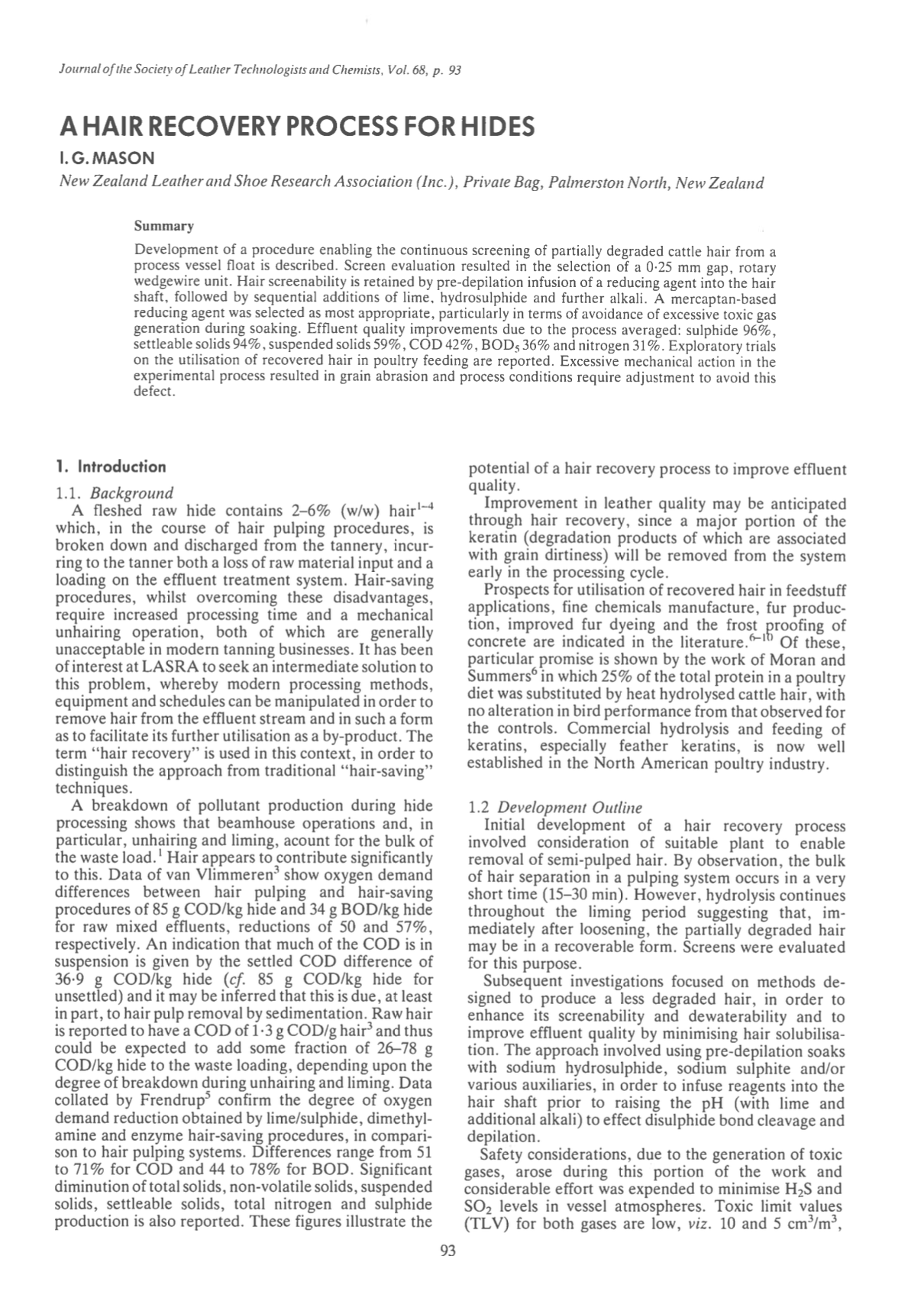 Development of a procedure enabling the continuous screening of partially degraded cattle hair from a process vessel float is described. Screen evaluation resulted in the selection of a 0.25 mm gap, rotary wedge wire unit. Hair screenability is retained by pre-depilation infusion of a reducing agent into the hair shaft. followed by sequential additions of lime. hydrosulphide and further alkali. A mercaptan-based reducing agent was selected as most appropriate, particularly in terms of avoidance of excessive toxic gas generation during soaking. Effluent quality improvements due to the process averaged: sulphide 96%, settleable solids 94%, suspended solids 59%, COD 42%, BOD5 36% and nitrogen 31%. Exploratory trials on the utilisation of recovered hair in poultry feeding are reported. Excessive mechanical action in the experimental process resulted in grain abrasion and process conditions require adjustment to avoid this defect.