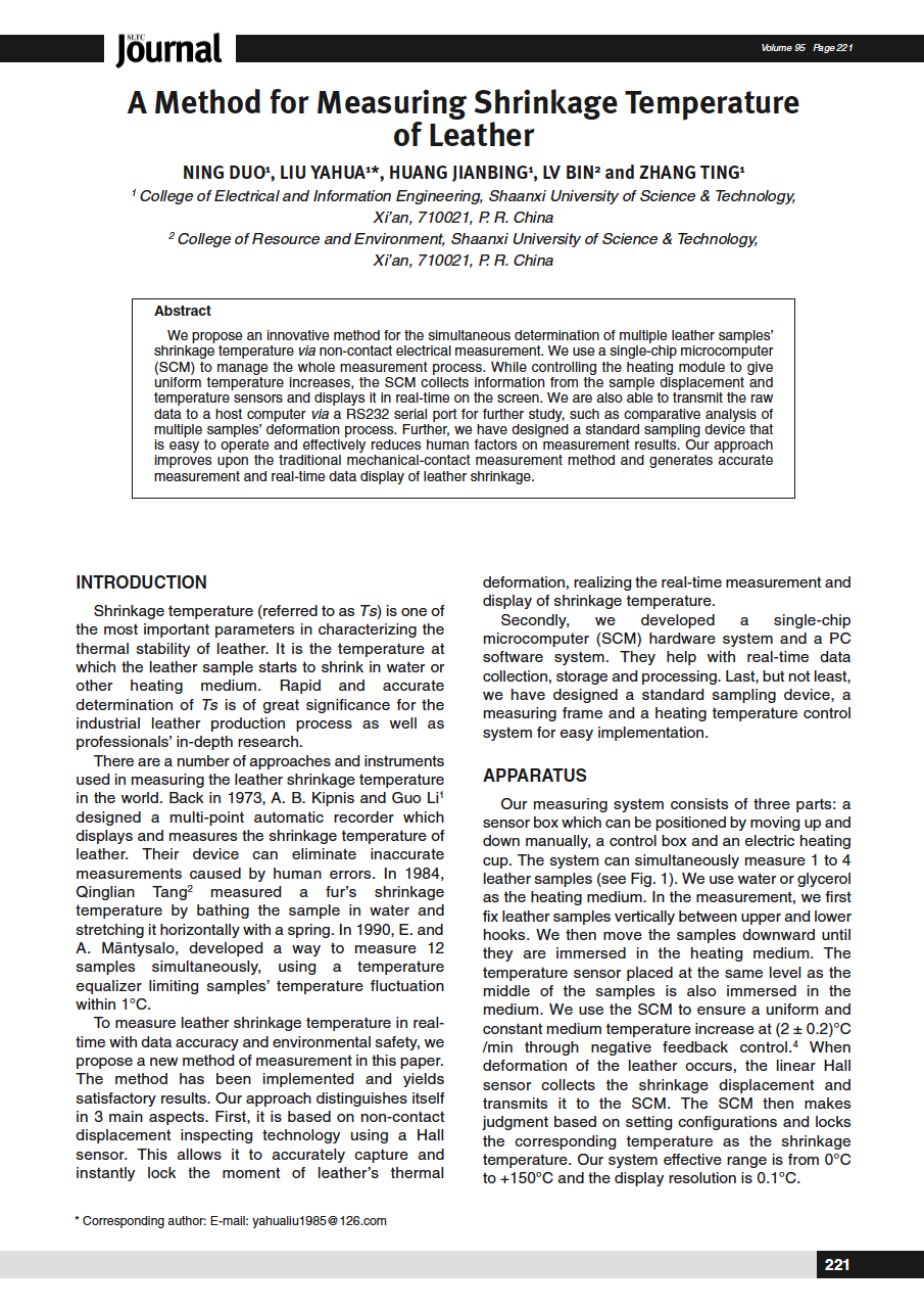 We propose an innovative method for the simultaneous determination of multiple leather samples’ shrinkage temperature via non-contact electrical measurement. We use a single-chip microcomputer (SCM) to manage the whole measurement process. While controlling the heating module to give uniform temperature increases, the SCM collects information from the sample displacement and temperature sensors and displays it in real-time on the screen. We are also able to transmit the raw data to a host computer via a RS232 serial port for further study, such as comparative analysis of multiple samples’ deformation process. Further, we have designed a standard sampling device that is easy to operate and effectively reduces human factors on measurement results. Our approach improves upon the traditional mechanical-contact measurement method and generates accurate measurement and real-time data display of leather shrinkage.