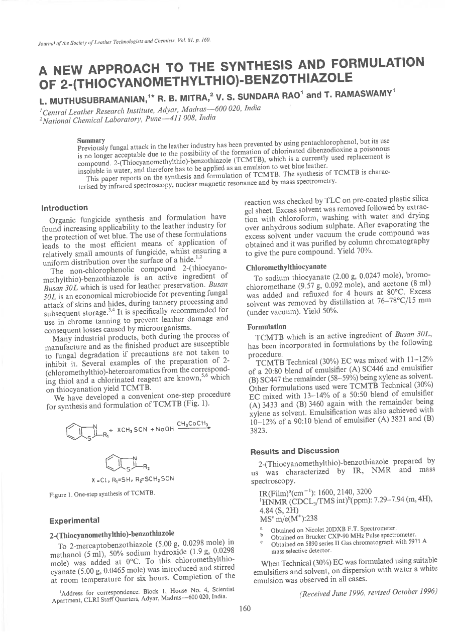 Previously fungal attack in the leather industry has been prevented by using pentachiorophenol, but its use is no longer acceptable due to the possibility of the formation of chlorinated dibenzodioxine a poisonous compound. 2-(Thiocyanomethylthio)-benzothiazole (TCMTB), which is a currently used replacement is insoluble in water, and therefore has to be applied as an emulsion to wet blue leather. This paper reports on the synthesis and formulation of TCMTB. The synthesis of TCMTB is charac tensed by infrared spectroscopy, nuclear magnetic resonance and by mass spectrometry.