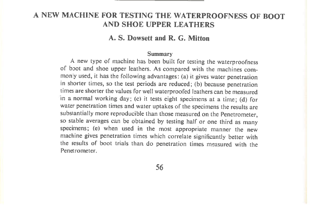A new type of machine has been built for testing the waterproofness of boot and shoe upper leathers. As compared with the machines corn nionly used, it has the following advantages: (a) it gives water penetration in shorter times, so the test periods are reduced; (b) because penetration times are shorter the values for well waterproofed leathers can be measured in a normal working day; (c) it tests eight specimens at a time; (d) for water penetration times and water uptakes of the specimens the results are substantially more reprodLicible than those measured on the Penetrometer, so stable averages can be obtained by testing half or one third as many specimens; (e) when used in the most appropriate manner the new machine gives penetration tinies which correlate significantly better with the results of boot trials than do penetration times measured with the Penetrometer.