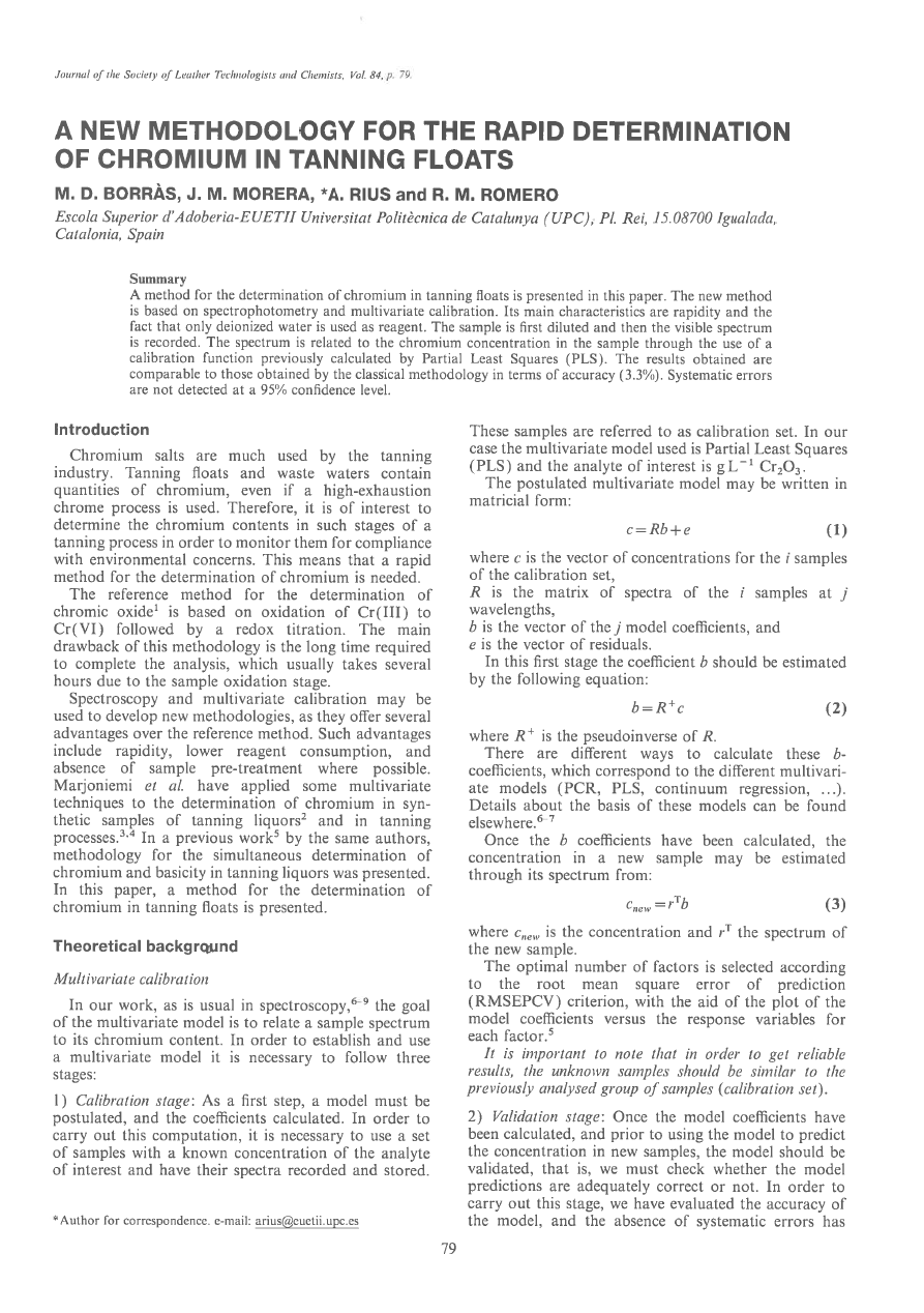 A method for the determination of chromium in tanning floats is presented. The new method is based on spectrophotometry and multivariate calibration. Its main characteristics are rapidity and the fact that only deionized water is used as reagent. The sample is first diluted and then the visible spectrum is recorded. The spectrum is related to the chromium concentration in the sample through a calibration function calculated by Partial Least Squares (PLS). The results are comparable in accuracy (3.3%) to the classical methodology. Systematic errors are not detected at a 95% confidence level.