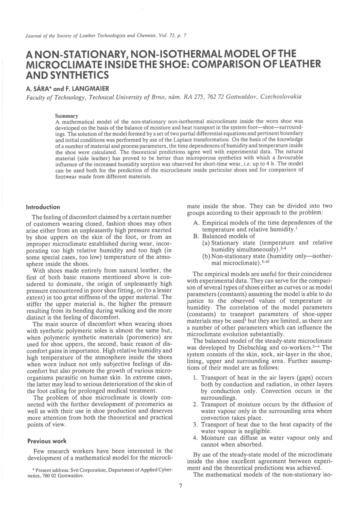A mathematical model of the non-stationary non-isothermal microclimate inside the worn shoe was developed on the basis of the balance of moisture and heat transport in the system foot—shoe—surroundings. The solution of the model formed by a set of two partial differential equations and pertinent boundary and initial conditions was performed by use of the Laplace transformation. On the basis of the knowledge of a number of material and process parameters, the time dependences of humidity and temperature inside the shoe were calculated. The theoretical predictions agree well with experimental data. The natural material (side leather) has proved to be better than microporous synthetics with which a favourable influence of the increased humidity sorption was observed for short-time wear, i.e. up to 4 h. The model can be used both for the prediction of the microclimate inside particular shoes and for comparison of footwear made from different materials.