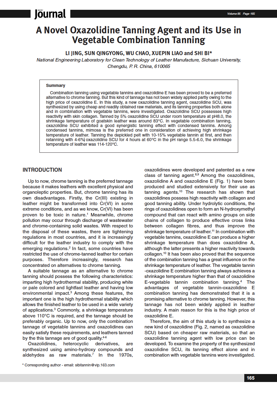 Combination tanning using vegetable tannins and oxazolidine Ehas been proved to be a preferred alternative to chrome tanning. But this kind of tannage has not been widely applied partly owing to the high price of oxazolidine E. In this study, a new oxazolidine tanning agent, oxazolidine SCU, was synthesized by using cheap and readily obtained raw materials, and its tanning properties both alone and in combination with vegetable tannins, were investigated. Oxazolidine SCU possesses high reactivity with skin collagen. Tanned by 5% oxazolidine SCU under room temperature at pH8.0, the shrinkage temperature of goatskin leather was around 83°C. In vegetable combination tanning, oxazolidine SCU exhibited a good synergistic tanning effect with condensed tannins. Among condensed tannins, mimosa is the preferred one in consideration of achieving high shrinkage temperature of leather. Tanning the depickled pelt with 10-15% vegetable tannin at first, and then retanning with 4-6% oxazolidine SCU for 4 hours at 60°C in the pH range 5.5-6.0, the shrinkage temperature of leather was 114-120°C.