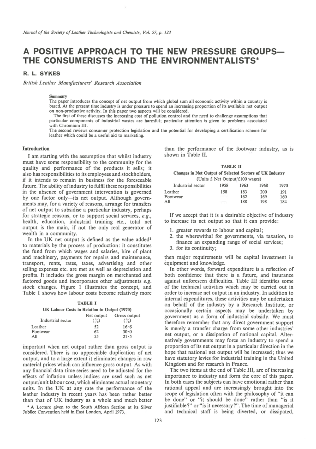 The paper introduces the concept of net output from which global sum all economic activity within a country is based. At the present time industry is under pressure to spend an increasing proportion of its available net output on non-productive activity. In this paper two aspects will be considered. The first of these discusses the increasing cost of pollution control and the need to challenge assumptions that particular components of industrial wastes are harmful; particular attention is given to problems associated with Chromium III. The second reviews consumer protection legislation and the potential for developing a certification scheme for leather which could be a useful aid to marketing.