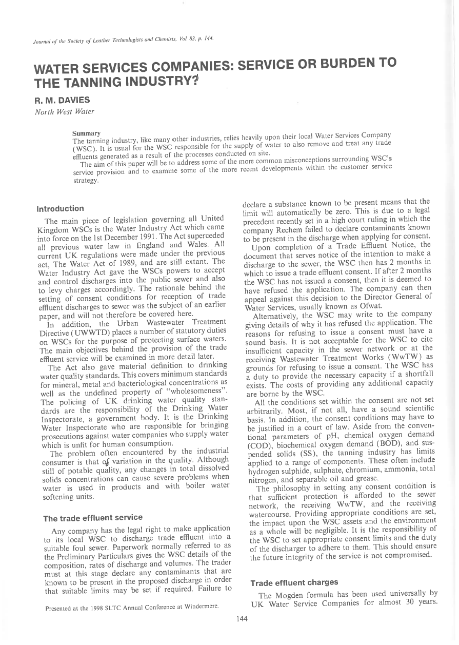 The tanning industry, like many other industries, relies heavily upon their local Water Services Company (WSC). It is usual for the WSC responsible for the supply of water to also remove and treat any trade effluents generated as a result of the processes conducted on site. The aim of this paper will be to address some of the more common misconceptions surrounding WSC’s service provision and to examine some of the more recent developments within the customer service strategy.