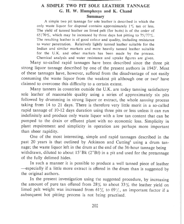 A simple two pit tannage for sole leather is described in which the only waste liquor for disposal contains approximately I % tan or less. The yield of tanned leather on limed pelt (for butts) is of the order of 65/70%, which may be increased by three days hot pitting to 75/77%. The resulting leather is of good colour and quality, including resistance to water penetration. Relatively lightly tanned leather suitable for the Indian and similar markets and more heavily tanned leather suitable for the U.K. and other markets has been made by the process. Chemical analysis and water resistance and uptake figures are given.