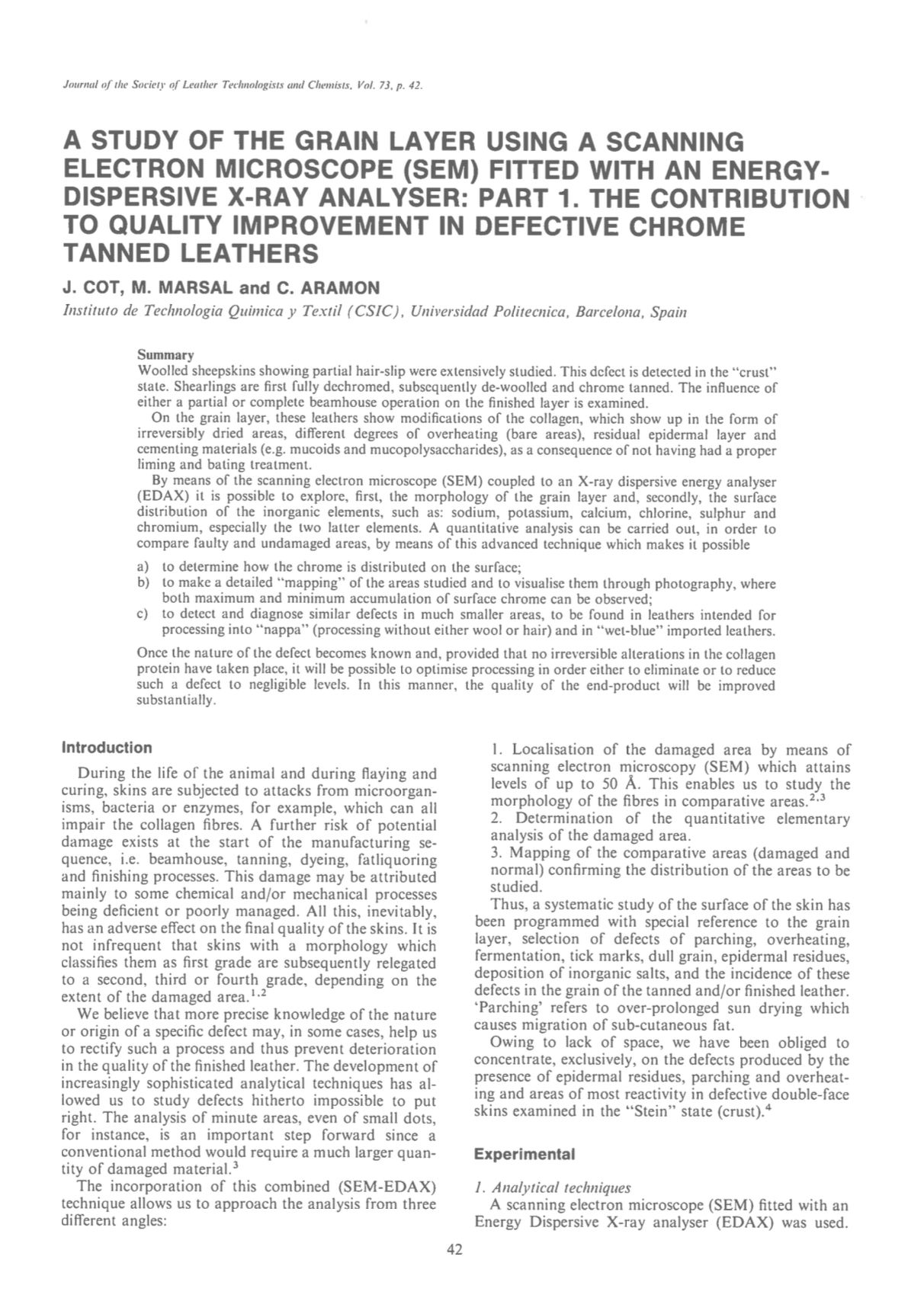Woolled sheepskins showing partial hair-slip were extensively studied. This defect is detected in the “crust” state. Shearlings are first fully dechromed, subsequently de-woolled and chrome tanned. The influence of either a partial or complete beamhouse operation on the finished layer is examined. On the grain layer, these leathers show modifications of the collagen, which show up in the form of irreversibly dried areas, different degrees of overheating (bare areas), residual epidermal layer and cementing materials (e.g. mucoids and mucopolysaccharides), as a consequence of not having had a proper liming and bating treatment. By means of the scanning electron microscope (SEM) coupled to an X-ray dispersive energy analyser (EDAX) it is possible to explore, first, the morphology of the grain layer and, secondly, the surface distribution of the inorganic elements, such as: sodium, potassium, calcium, chlorine, sulphur and chromium. especially the two latter elements. A quantitative analysis can be carried out, in order to compare faulty and undamaged areas, by means of this advanced technique which makes it possible
