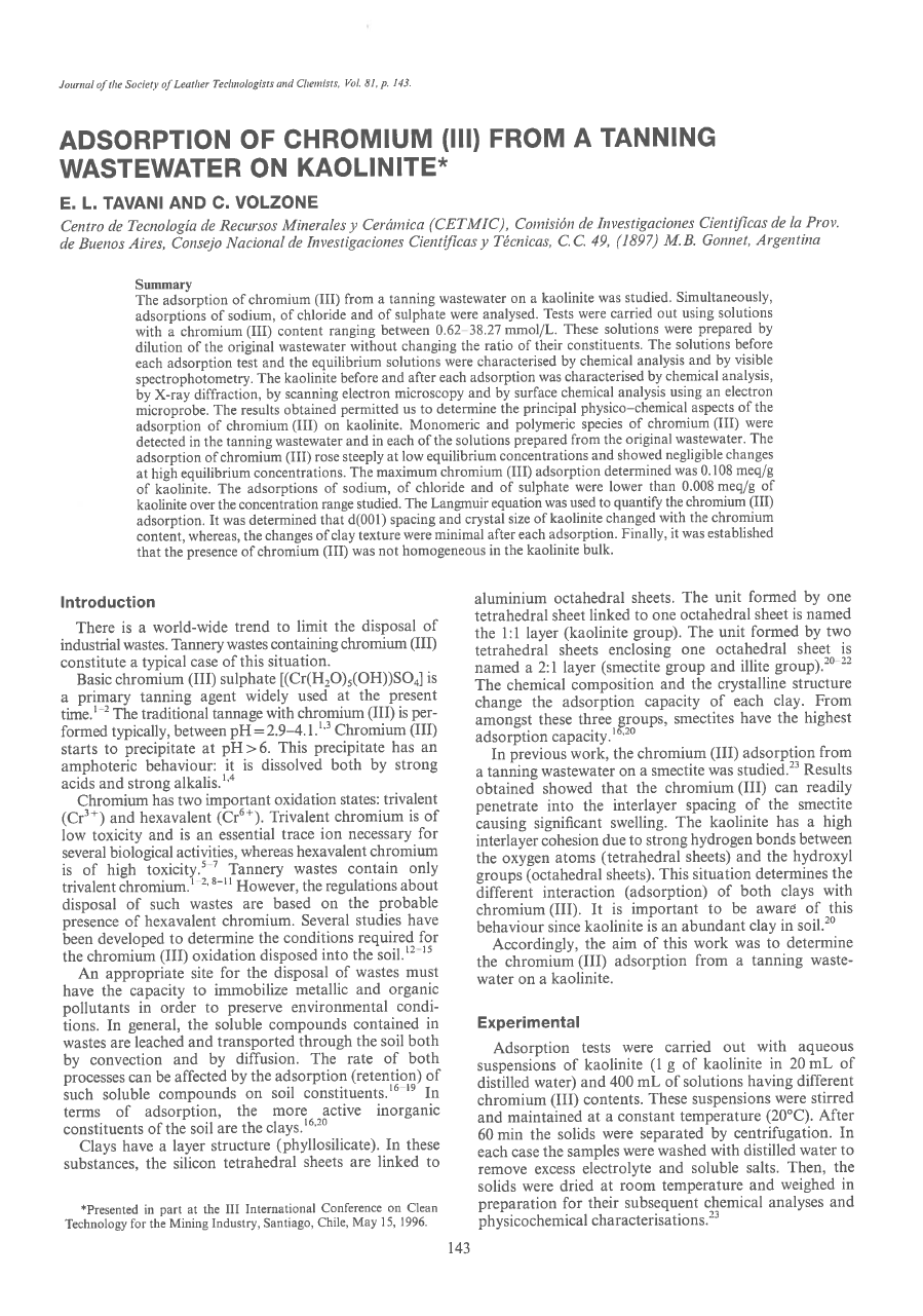 The adsorption of chromium (III) from a tanning wastewater on a kaolinite was studied. Simultaneously, adsorptions of sodium, of chloride and of sulphate were analysed. Tests were carried out using solutions with a chromium (III) content ranging between 0.62—38.27 mmol,L. These solutions were prepared by dilution of the original wastewater without changing the ratio of their constituents. The solutions before each adsorption test and the equilibrium solutions were characterised by chemical analysis and by visible spectrophotometry. The kaolinite before and after each adsorption was characterised by chemical analysis, by X-ray diffraction, by scanning electron microscopy and by surface chemical analysis using an electron microprobe. The results obtained permitted us to determine the principal physico—chemical aspects of the adsorption of chromium (III) on kaolinite. Monomeric and polymeric species of chromium (III) were detected in the tanning wastewater and in each of the solutions prepared from the original wastewater. The adsorption of chromium (Ill) rose steeply at low equilibrium concentrations and showed negligible changes at high equilibrium concentrations. The maximum chromium (III) adsorption determined was 0.108 meq’g of kaolinite. The adsorptions of sodium, of chloride and of sulphate were lower than 0.008 meq/g of kaolinite over the concentration range studied. The Langmuir equation was used to quantify the chromium (III) adsorption. It was determined that d(00l) spacing and crystal size of kaolinite changed with the chromium content, whereas, the changes of clay texture were minimal after each adsorption. Finally, it was established that the presence of chromium (III) was not homogeneous in the kaolinite bulk.
