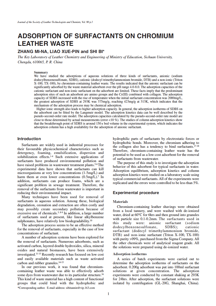 We have studied the adsorptions of aqueous solutions of three kinds of surfactants, anionic (sodium dodecylbenzenesulfonate, SDBS), cationic (dodecyl trimethylammonium bromide, DTB) and a non-ionic (Triton X-100, TX-100), by chromium-containing leather waste. The results indicated that the anionic surfactant can be significantly adsorbed by the waste material adsorbent over the pH range 4.0-8.0. The adsorption capacities of the cationic surfactant and non-ionic surfactant on the adsorbent are limited. These facts imply that the predominant adsorption sites of such an adsorbent are amino groups and the Cr(III) combined with collagen. The adsorption capacity of SDBS increased with the rise of temperature when the initial surfactant concentration was 2000mg/L, the greatest adsorption of SDBS at 293K was 375mg/g, reaching 423mg/g at 313K, which indicates that the mechanism of the adsorption process may be chemical adsorption.