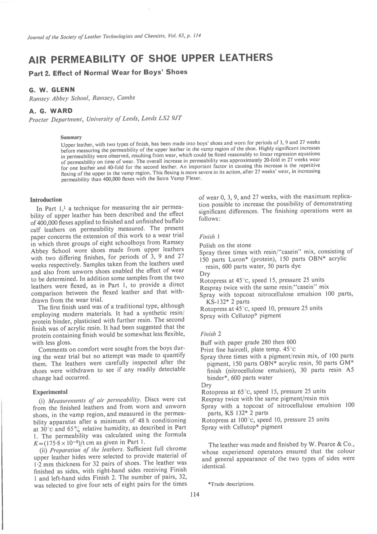 Upper leather, with two types of finish, has been made into boys’ shoes and worn for periods of 3, 9 and 27 weeks before measuring the permeability of the upper leather in the vamp region of the shoe. Highly significant increases in permeability were observed, resulting from wear, which could be fitted reasonably to linear regression equations of permeability on time of wear. The overall increase in permeability was approximately 20-fold in 27 weeks wear for one leather and 40-fold for the second leather. An important factor in causing this increase is the repetitive flexing of the upper in the vamp region. This flexing is more severe in its action, after 27 weeks’ wear, in increasing permeability than 400,000 flexes with the Satra Vamp Flexer.