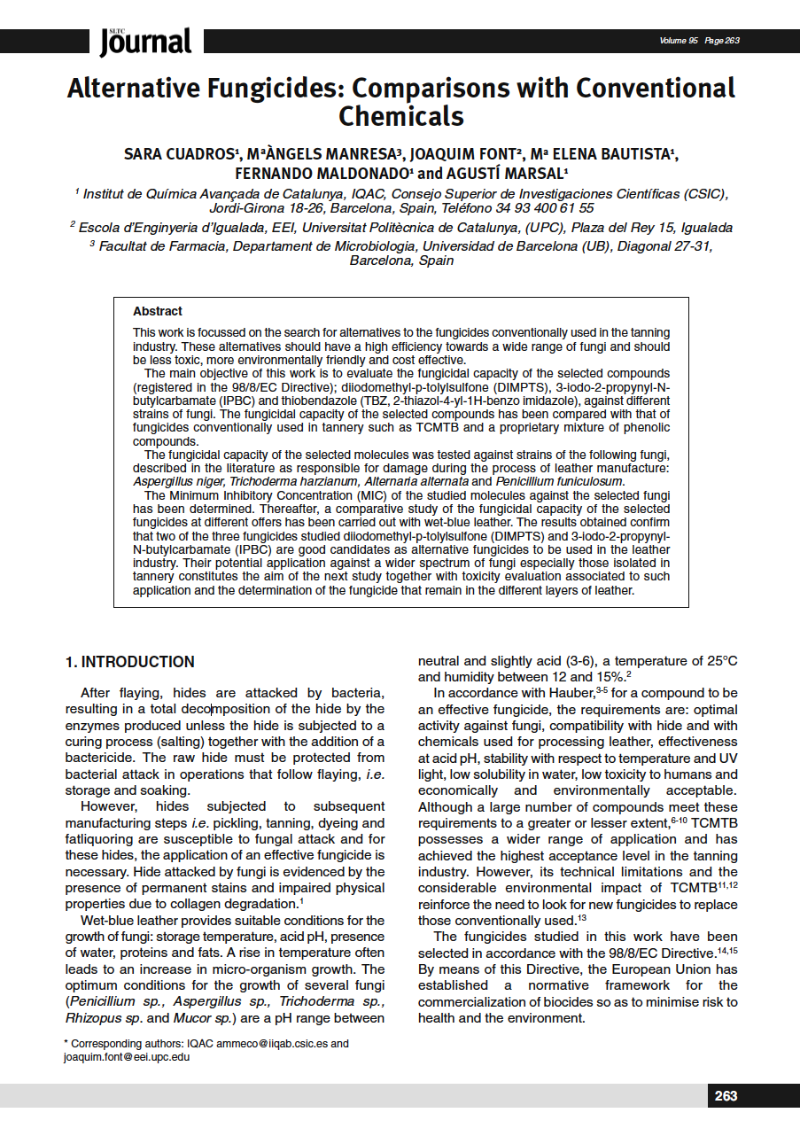 This work is focussed on the search for alternatives to the fungicides conventionally used in the tanning industry. These alternatives should have a high efficiency towards a wide range of fungi and should be less toxic, more environmentally friendly and cost effective. The main objective of this work is to evaluate the fungicidal capacity of the selected compounds (registered in the 98/8/EC Directive); diiodomethyl-p-tolylsulfone (DIMPTS), 3-iodo-2-propynyl-Nbutylcarbamate (IPBC) and thiobendazole (TBZ, 2-thiazol-4-yl-1H-benzo imidazole), against different strains of fungi. The fungicidal capacity of the selected compounds has been compared with that of fungicides conventionally used in tannery such as TCMTB and a proprietary mixture of phenolic compounds. The fungicidal capacity of the selected molecules was tested against strains of the following fungi, described in the literature as responsible for damage during the process of leather manufacture: Aspergillus niger, Trichoderma harzianum, Alternaria alternata and Penicillium funiculosum. The Minimum Inhibitory Concentration (MIC) of the studied molecules against the selected fungi has been determined. Thereafter, a comparative study of the fungicidal capacity of the selected fungicides at different offers has been carried out with wet-blue leather. The results obtained confirm that two of the three fungicides studied diiodomethyl-p-tolylsulfone (DIMPTS) and 3-iodo-2-propynyl- N-butylcarbamate (IPBC) are good candidates as alternative fungicides to be used in the leather industry. Their potential application against a wider spectrum of fungi especially those isolated in tannery constitutes the aim of the next study together with toxicity evaluation associated to such application and the determination of the fungicide that remain in the different layers of leather.
