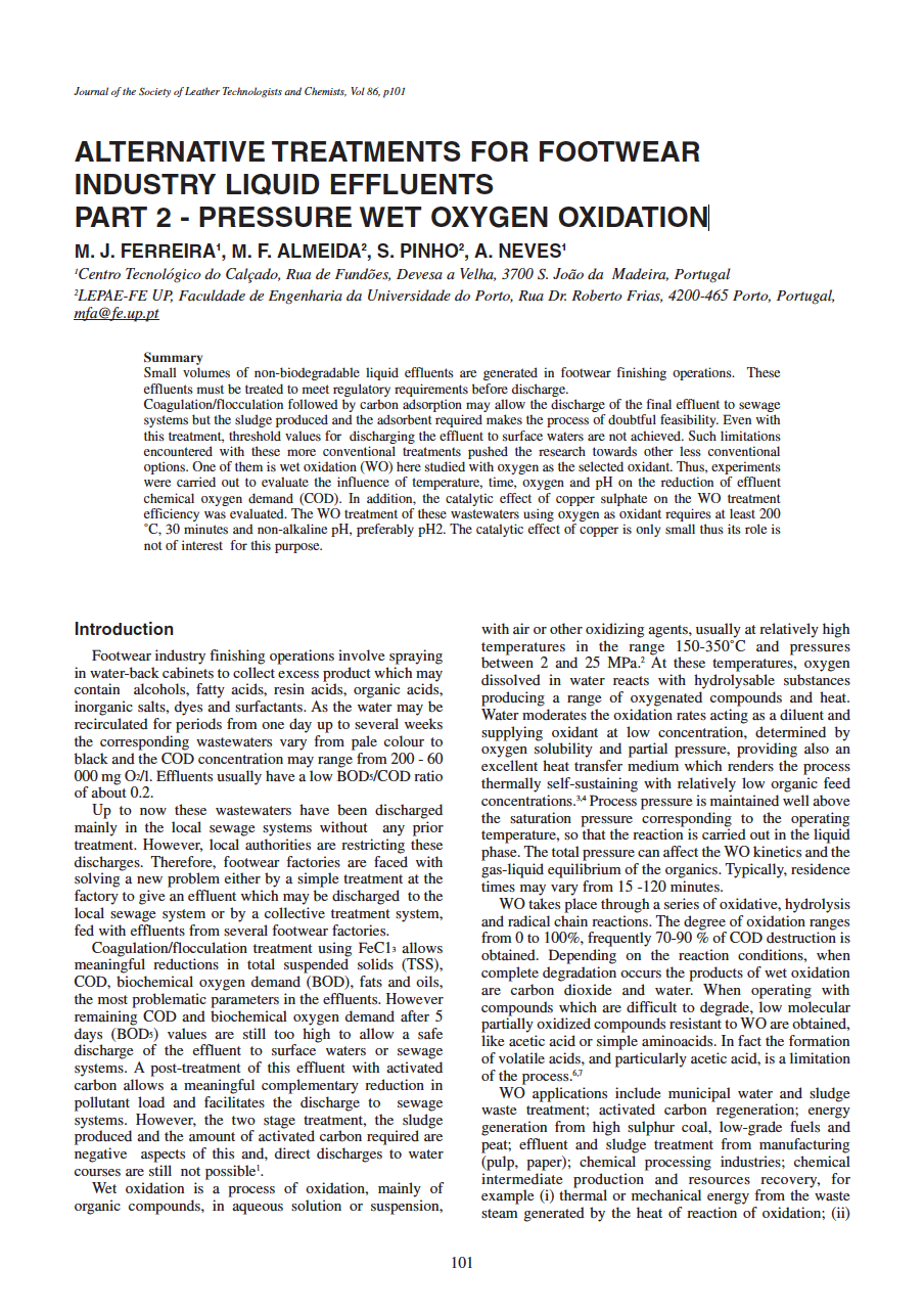 Small volumes of non-biodegradable liquid effluents are generated in footwear finishing operations. These effluents must be treated to meet regulatory requirements before discharge. Coagulation/flocculation followed by carbon adsorption may allow the discharge of the final effluent to sewage systems but the sludge produced and the adsorbent required makes the process of doubtful feasibility. Even with this treatment, threshold values for discharging the effluent to surface waters are not achieved. Such limitations encountered with these more conventional treatments pushed the research towards other less conventional options. One of them is wet oxidation (WO) here studied with oxygen as the selected oxidant. Thus, experiments were carried out to evaluate the influence of temperature, time, oxygen and pH on the reduction of effluent chemical oxygen demand (COD). In addition, the catalytic effect of copper sulphate on the WO treatment efficiency was evaluated. The WO treatment of these wastewaters using oxygen as oxidant requires at least 200 °C, 30 minutes and non-alkaline pH, preferably pH2. The catalytic effect of copper is only small thus its role is not of interest for this purpose.