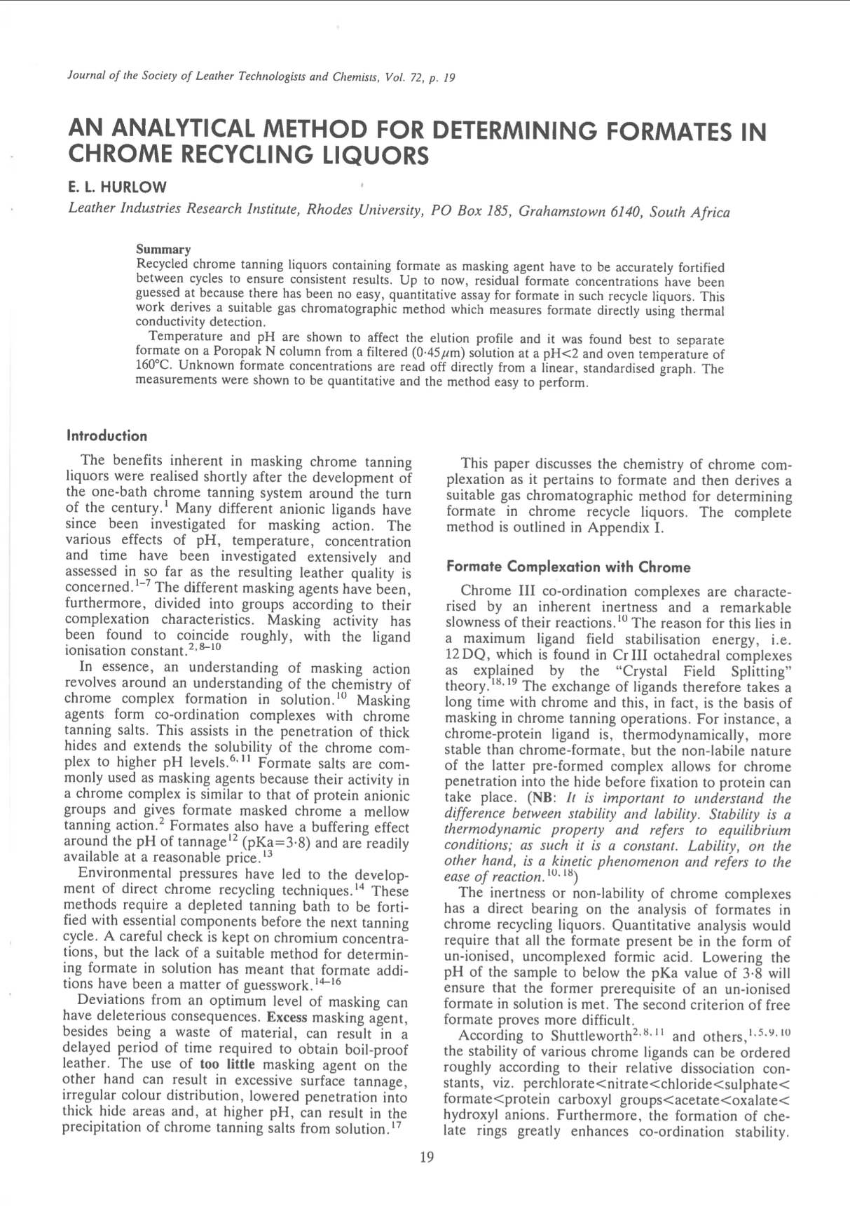 Recycled chrome tanning liquors containing formate as masking agent have to be accurately fortified between cycles to ensure consistent results. Up to now, residual formate concentrations have been guessed at because there has been no easy, quantitative assay for formate in such recycle liquors. This work derives a suitable gas chromatographic method which measures formate directly using thermal conductivity detection. Temperature and pH are shown to affect the elution profile and it was found best to separate formate on a Poropak N column from a filtered (0.45/µm) solution at a pH<2 and oven temperature of 160oC. Unknown formate concentrations are read off directly from a linear, standardised graph. The measurements were shown to be quantitative and the method easy to perform.
