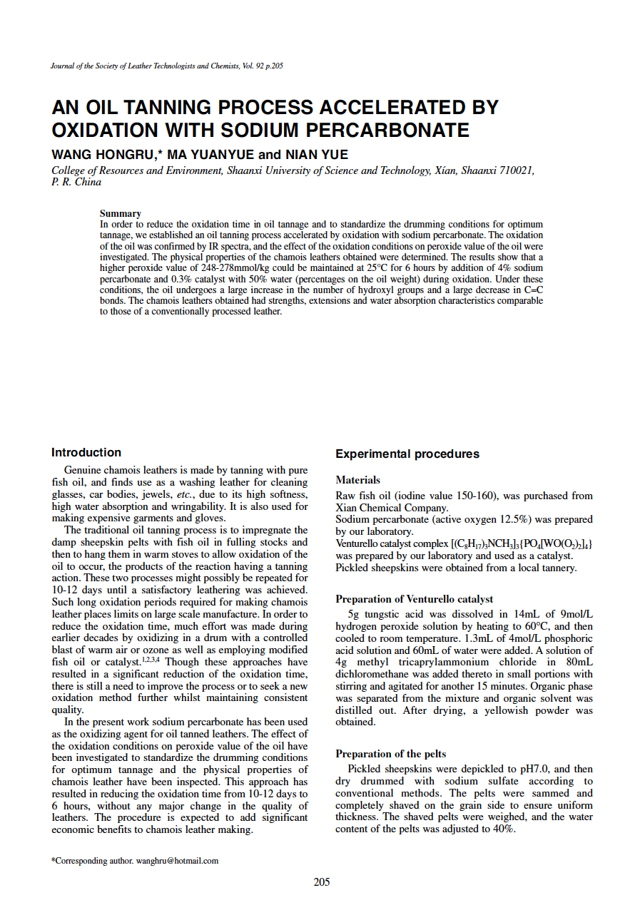 In order to reduce the oxidation time in oil tannage and to standardize the drumming conditions for optimum tannage, we established an oil tanning process accelerated by oxidation with sodium percarbonate. The oxidation of the oil was confirmed by IR spectra, and the effect of the oxidation conditions on peroxide value of the oil were investigated. The physical properties of the chamois leathers obtained were determined. The results show that a higher peroxide value of 248-278mmol/kg could be maintained at 25°C for 6 hours by addition of 4% sodium percarbonate and 0.3% catalyst with 50% water (percentages on the oil weight) during oxidation. Under these conditions, the oil undergoes a large increase in the number of hydroxyl groups and a large decrease in C=C bonds. The chamois leathers obtained had strengths, extensions and water absorption characteristics comparable to those of a conventionally processed leather.