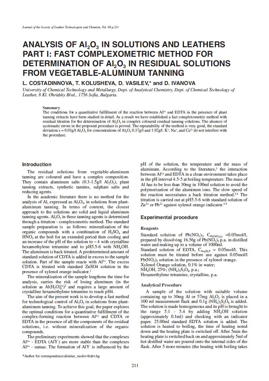 The conditions for a quantitative fulfillment of the reaction between Al3+ and EDTA in the presence of plant tanning extracts have been studied in detail. As a result we have established a fast complexometric method with residual titration for the determination of Al2O3 in complex coloured residual tanning solutions. The absence of systematic errors in the proposed procedure is proved. The repeatability of the method is very good, the standard deviation s = 0.01g/l Al2O3 for concentrations of Al2O3 0.37g/l and 1.92g/l. K+, Na+, and Ca2+ do not interfere with the procedure.