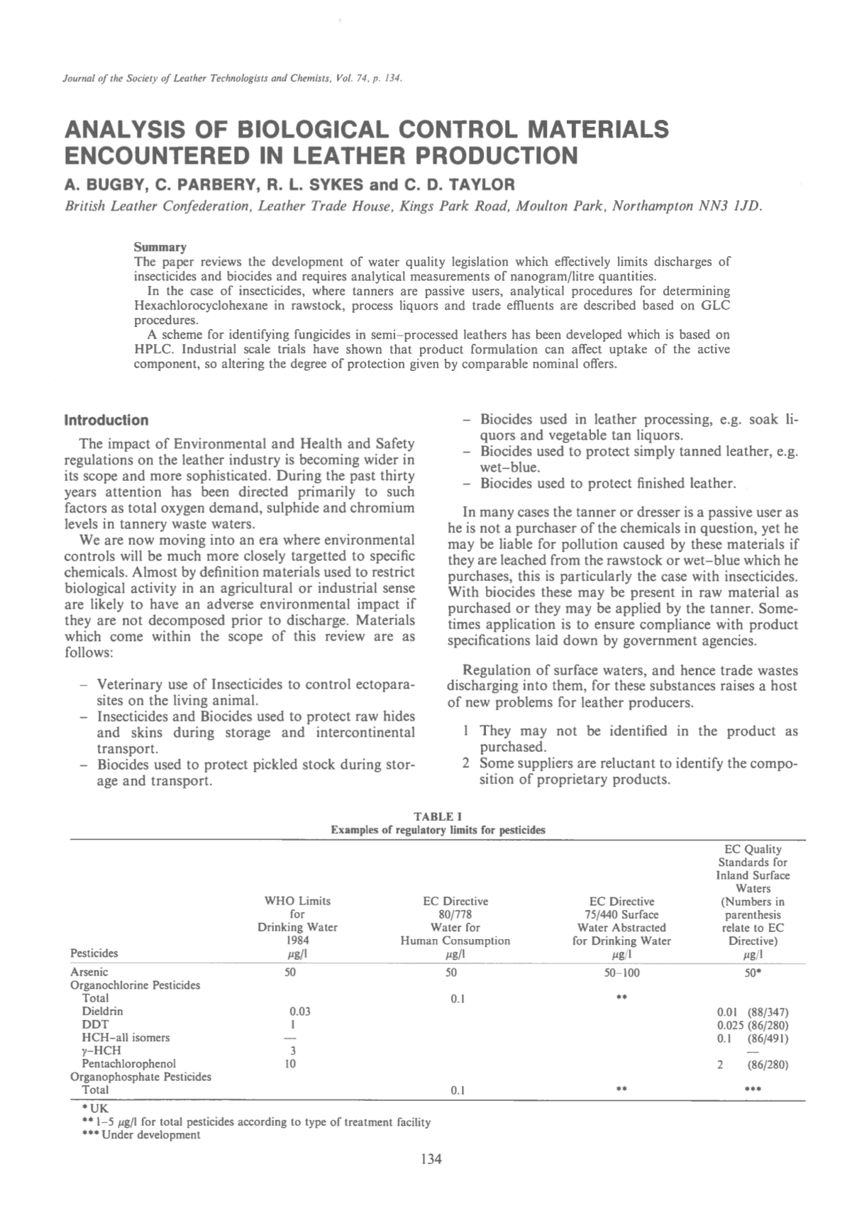 The paper reviews the development of water quality legislation which effectively limits discharges of insecticides and biocides and requires analytical measurements of nanogram/litre quantities. In the case of insecticides, where tanners are passive users, analytical procedures for determining Hexachlorocyclohexane in raw stock, process liquors and trade effluents are described based on GLC procedures. A scheme for identifying fungicides in semi-processed leathers has been developed which is based on HPLC. Industrial scale trials have shown that product formulation can affect uptake of the active component, so altering the degree of protection given by comparable nominal offers.