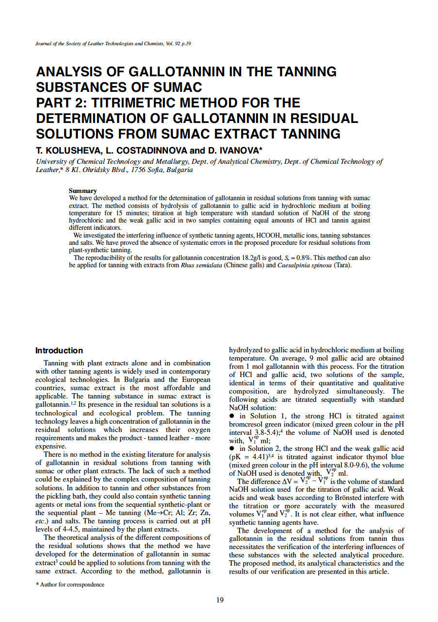 We have developed a method for the determination of gallotannin in residual solutions from tanning with sumac extract. The method consists of hydrolysis of gallotannin to gallic acid in hydrochloric medium at boiling temperature for 15 minutes; titration at high temperature with standard solution of NaOH of the strong hydrochloric and the weak gallic acid in two samples containing equal amounts of HCl and tannin against different indicators.