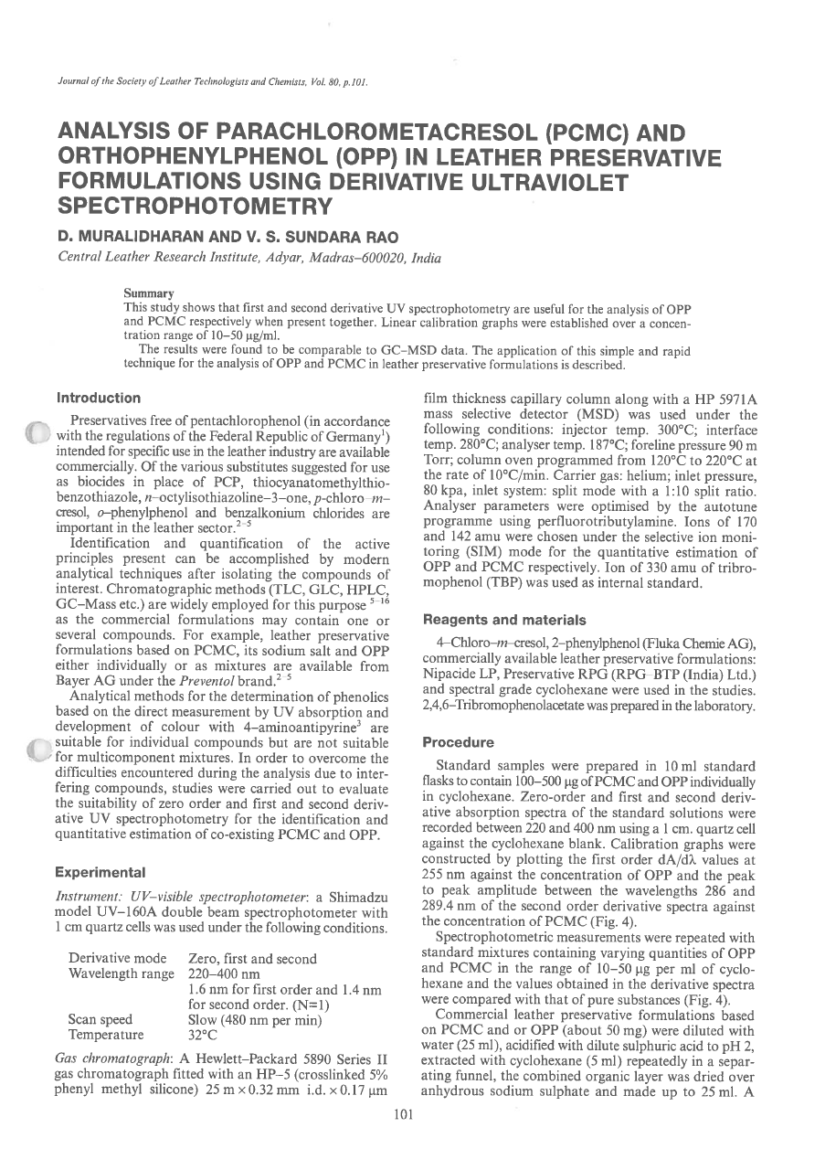 Analysis Of Parachlorometacresol (PCMC) And Orthophenylphenol (OPP) In Leather Preservative Formulations Using Derivative Ultraviolet Spectrophotometry