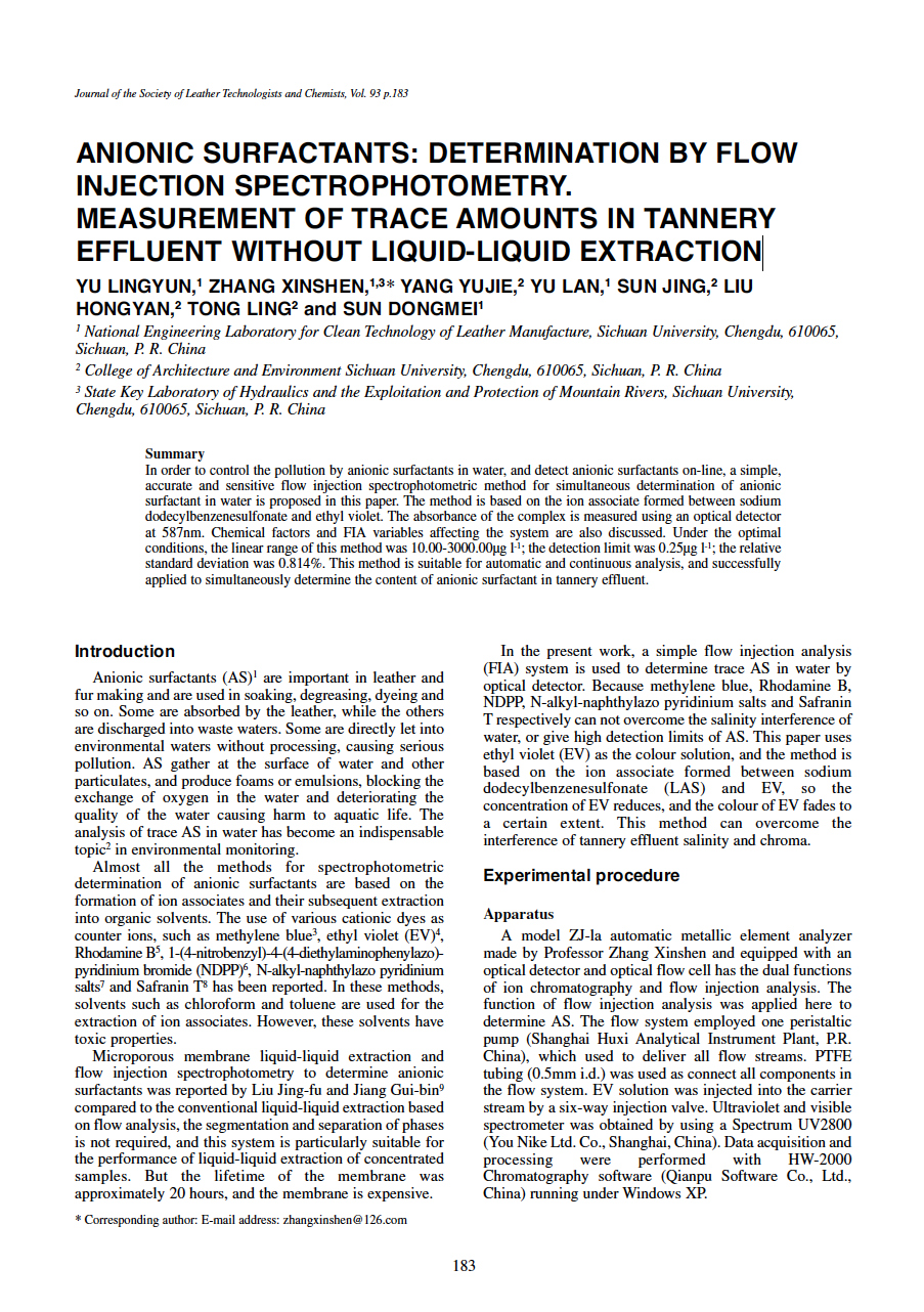 In order to control the pollution by anionic surfactants in water, and detect anionic surfactants on-line, a simple, accurate and sensitive flow injection spectrophotometric method for simultaneous determination of anionic surfactant in water is proposed in this paper. The method is based on the ion associate formed between sodium dodecylbenzenesulfonate and ethyl violet. The absorbance of the complex is measured using an optical detector at 587nm. Chemical factors and FIA variables affecting the system are also discussed. Under the optimal conditions, the linear range of this method was 10.00-3000.00μg l-1; the detection limit was 0.25μg l-1; the relative standard deviation was 0.814%. This method is suitable for automatic and continuous analysis, and successfully applied to simultaneously determine the content of anionic surfactant in tannery effluent.