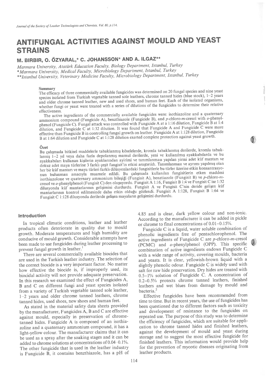 The efficacy of three commercially available fungicides was determined on 20 fungal species and nine yeast species isolated from Turkish vegetable tanned sole leathers, chrome tanned hides (blue stock), 1—2 years and older chrome tanned leather, new and used shoes, and human feet. Each of the isolated organisms, whether fungi or yeast were treated with a series of dilutions of the fungicides to determine their relative effectiveness. The active ingredients of the commercially available fungicides were: isothiazoline and a quaternary ammonium compound (Fungicide A), benzthiazole (Fungicide B), and p-chloro-m-cresol with o-phenyl phenol (Fungicide C). Fungal attack was controlled with Fungicide A at a 1:16 dilution, Fungicide B at 1:4 dilution, and Fungicide C at 1:32 dilution. It was found that Fungicide A and Fungicide C were more effective than Fungicide B in controlling fungal growth on leather. Fungicide A at 1:128 dilution, Fungicide B at 1:64 dilution and Fungicide C at 1:128 dilution exerted complete protection against yeast growth.