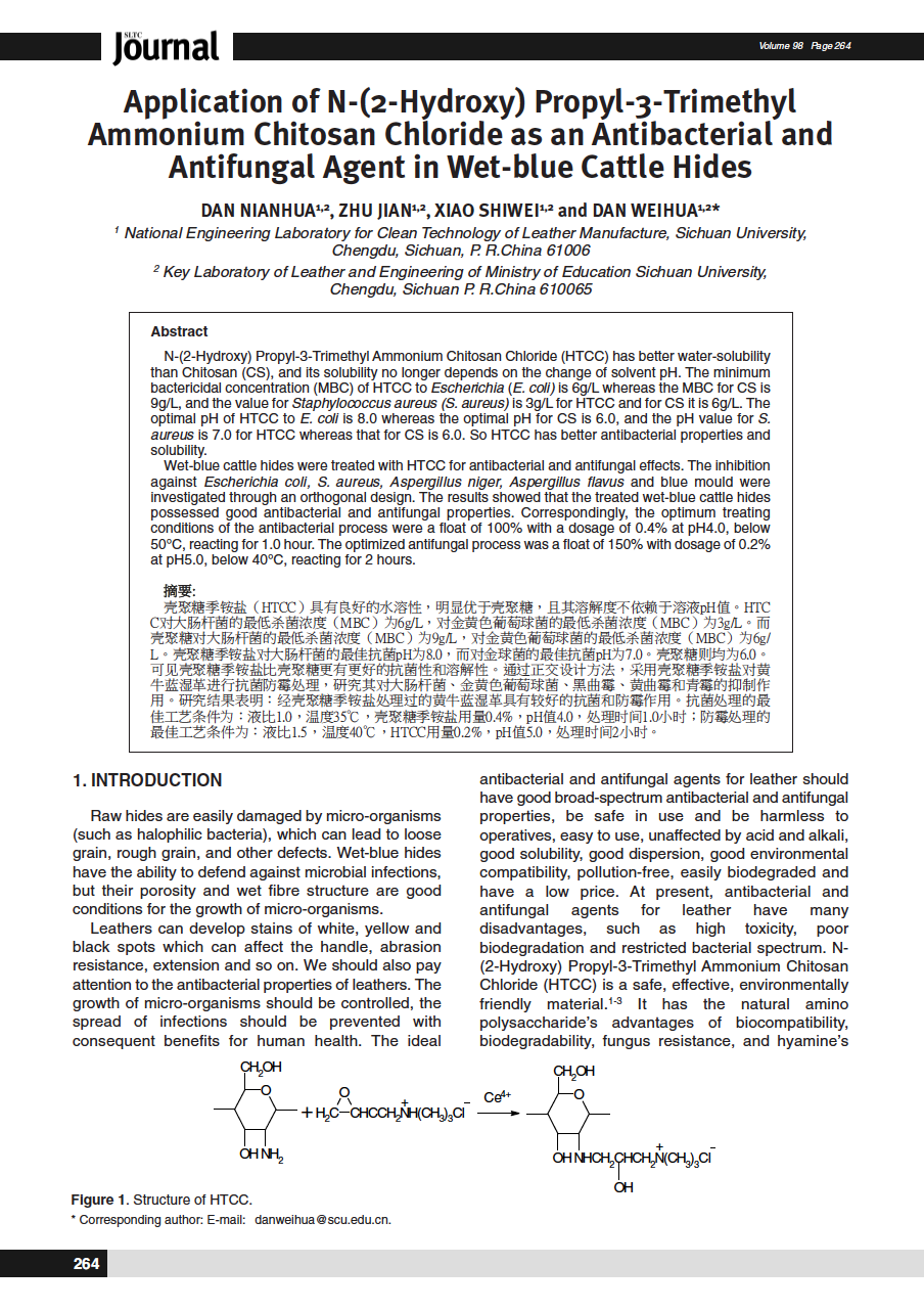 Application of N-(2-Hydroxy) Propyl-3-Trimethyl Ammonium Chitosan Chloride as an Antibacterial and Antifungal Agent in Wet-blue Cattle Hides