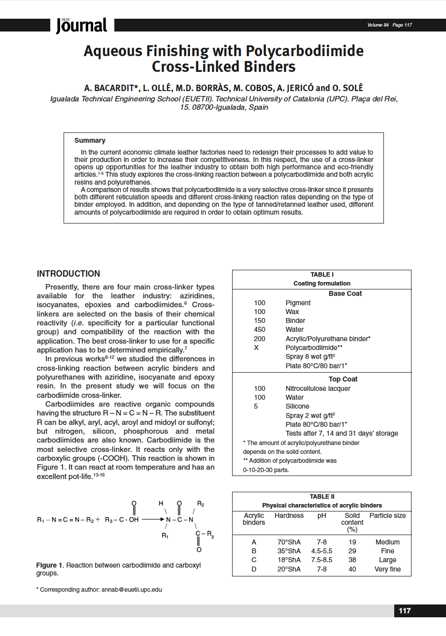 In the current economic climate leather factories need to redesign their processes to add value to their production in order to increase their competitiveness. In this respect, the use of a cross-linker opens up opportunities for the leather industry to obtain both high performance and eco-friendly articles.1-5 This study explores the cross-linking reaction between a polycarbodiimide and both acrylic resins and polyurethanes.