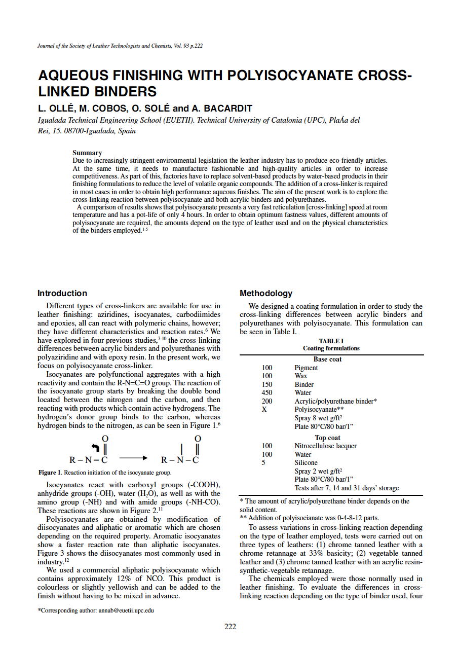 Due to increasingly stringent environmental legislation the leather industry has to produce eco-friendly articles. At the same time, it needs to manufacture fashionable and high-quality articles in order to increase competitiveness. As part of this, factories have to replace solvent-based products by water-based products in their finishing formulations to reduce the level of volatile organic compounds. The addition of a cross-linker is required in most cases in order to obtain high performance aqueous finishes. The aim of the present work is to explore the cross-linking reaction between polyisocyanate and both acrylic binders and polyurethanes.