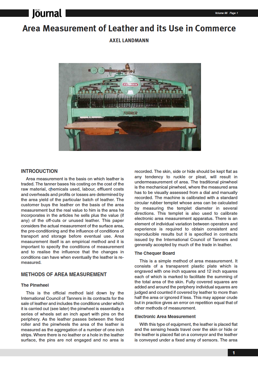 Area measurement is the basis on which leather is traded. The tanner bases his costing on the cost of the raw material, chemicals used, labour, effluent costs and overheads and profits or losses are determined by the area yield of the particular batch of leather. The customer buys the leather on the basis of the area measurement but the real value to him is the area he incorporates in the articles he sells plus the value (if any) of the off-cuts or unused leather. This paper considers the actual measurement of the surface area, the pre-conditioning and the influence of conditions of transport and storage before eventual use. Area measurement itself is an empirical method and it is important to specify the conditions of measurement and to realise the influence that the changes in conditions can have when eventually the leather is remeasured.