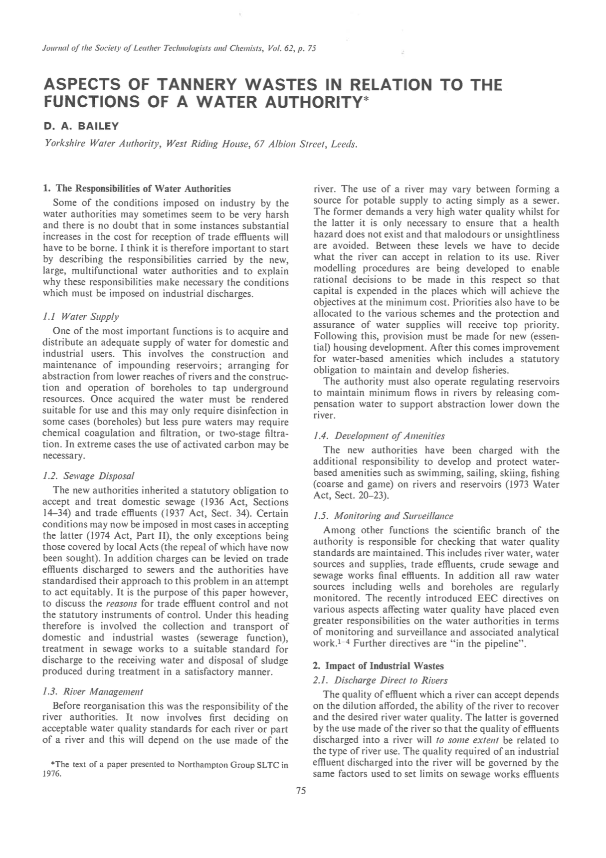Aspects of Tannery Wastes in Relation to the Functions of a Water Authority