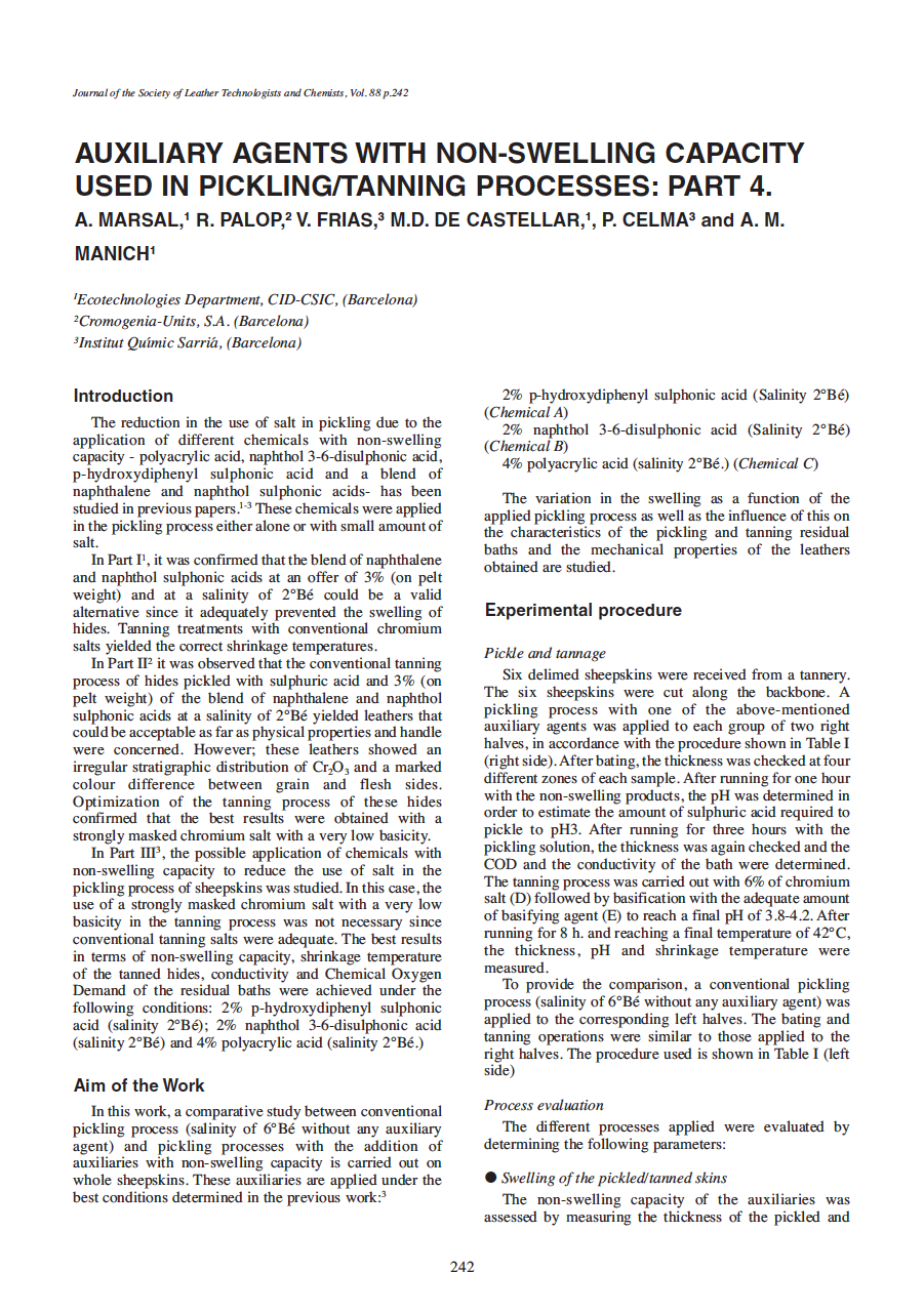 In Part III, the possible application of chemicals with non-swelling capacity to reduce the use of salt in the pickling process of sheepskins was studied. In this case, the use of a strongly masked chromium salt with a very low basicity in the tanning process was not necessary since conventional tanning salts were adequate. The best results in terms of non-swelling capacity, shrinkage temperature of the tanned hides, conductivity and Chemical Oxygen Demand of the residual baths were achieved under the following conditions: 2% p-hydroxydiphenyl sulphonic acid (salinity 2°Bé); 2% naphthol 3-6-disulphonic acid (salinity 2°Bé) and 4% polyacrylic acid (salinity 2°Bé.)