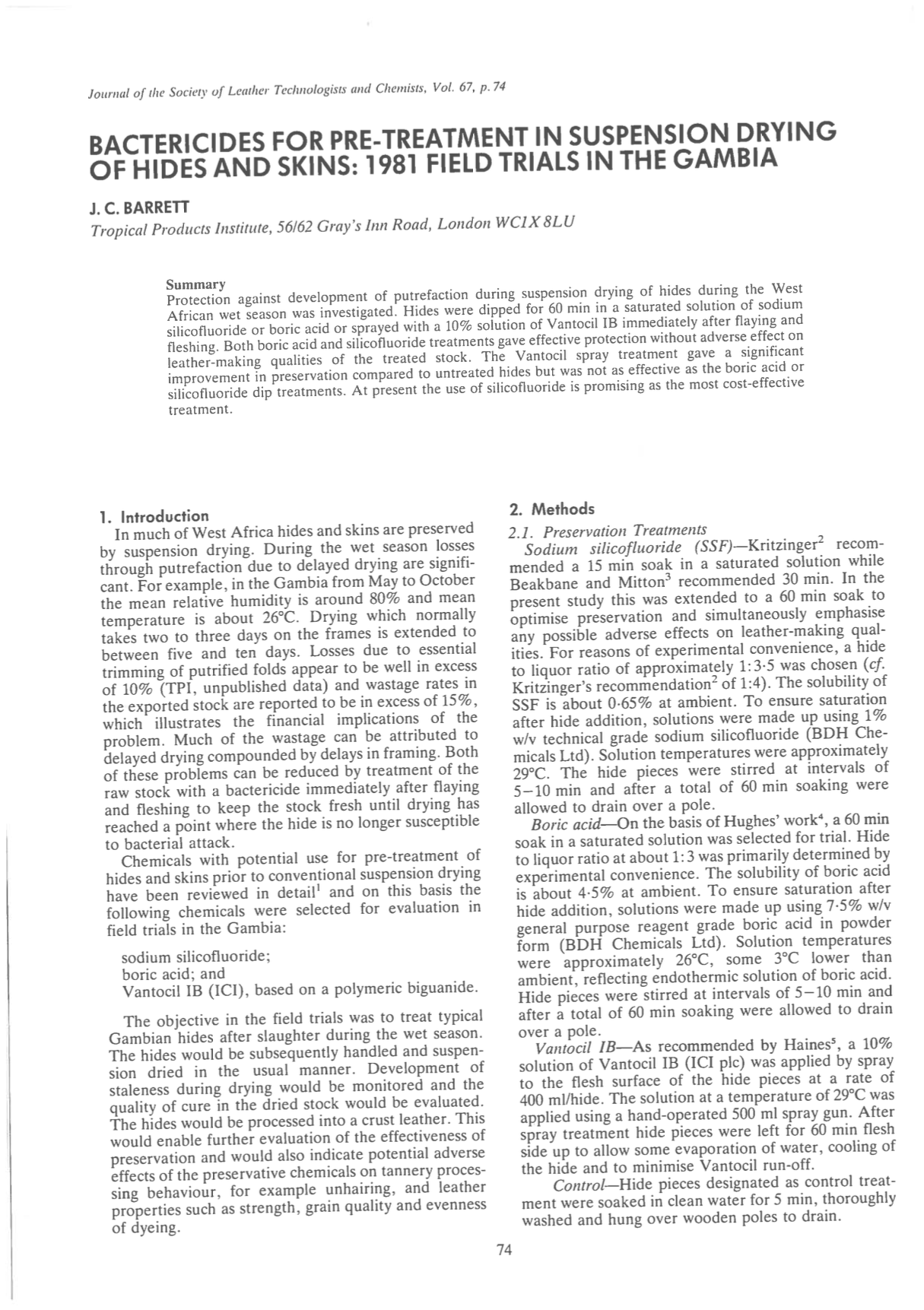 Protection against development of putrefaction during suspension drying of hides during the West African wet season was investigated. Hides were dipped for 60mm in a saturated solution of sodium silicofluoride or boric acid or sprayed with a 10% solution of Vantocil lB immediately after flaying and fleshing. Both boric acid and silicofluoride treatments gave effective protection without adverse effect on leather-making qualities of the treated stock. The Vantocil spray treatment gave a significant improvement in preservation compared to untreated hides but was not as effective as the boric acid or silicofluoride dip treatments. At present the use of silicofluoride is promising as the most cost-effective treatment.