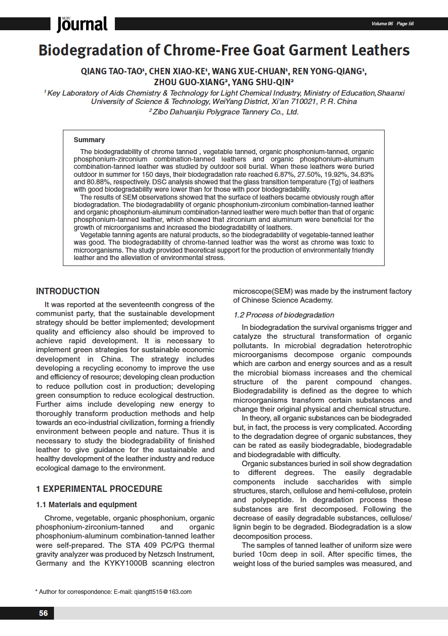 The biodegradability of chrome tanned , vegetable tanned, organic phosphonium-tanned, organic phosphonium-zirconium combination-tanned leathers and organic phosphonium-aluminum combination-tanned leather was studied by outdoor soil burial. When these leathers were buried outdoor in summer for 150 days, their biodegradation rate reached 6.87%, 27.50%, 19.92%, 34.83% and 80.88%, respectively. DSC analysis showed that the glass transition temperature (Tg) of leathers with good biodegradability were lower than for those with poor biodegradability.