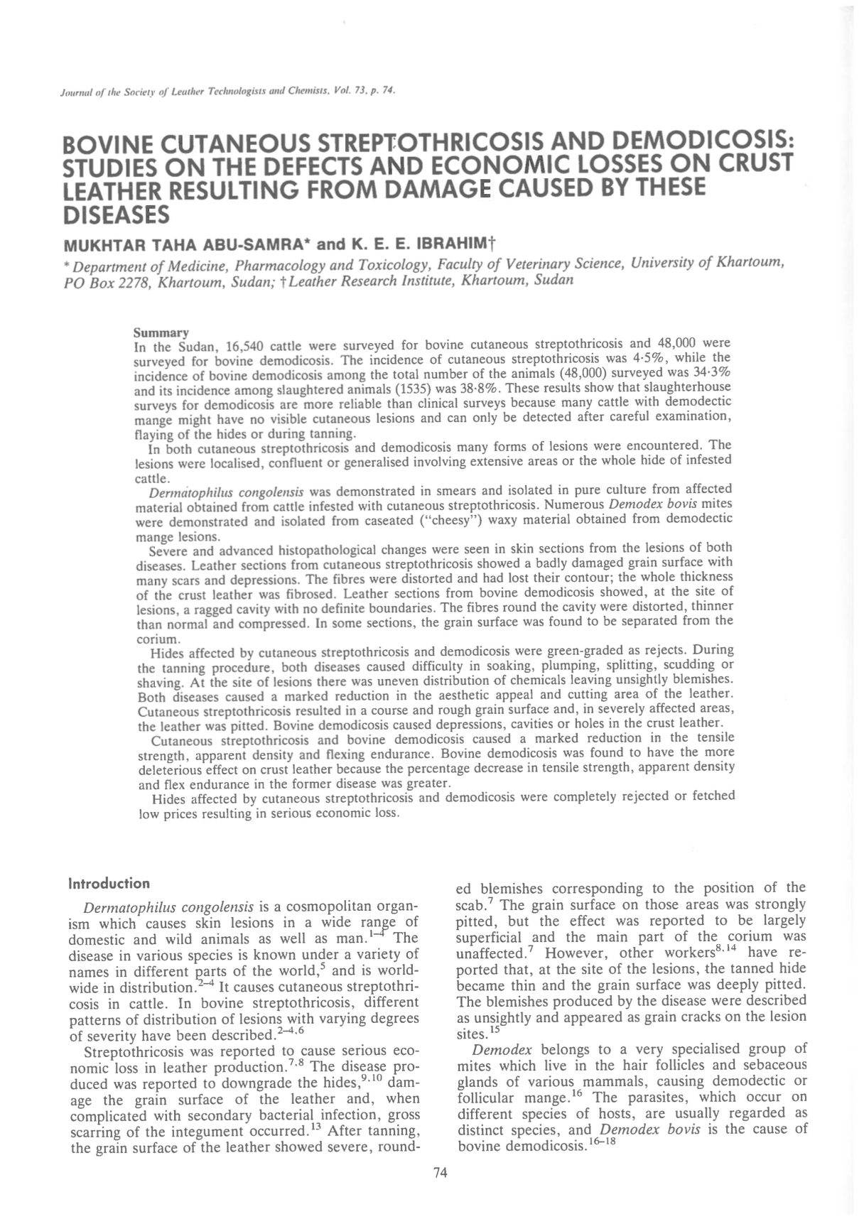 In the Sudan, 16,540 cattle were surveyed for bovine cutaneous streptothricosis and 48,000 were surveyed for bovine demodicosis. The incidence of cutaneous streptothricosis was 4.5%, while the incidence of bovine demodicosis among the total number of the animals (48,000) surveyed was 34.3% and its incidence among slaughtered animals (1535) was 38.8%. These results show that slaughterhouse surveys for demodicosis are more reliable than clinical surveys because many cattle with demodectic mange might have no visible cutaneous lesions and can only be detected after careful examination, flaying of the hides or during tanning. In both cutaneous streptothricosis and demodicosis many forms of lesions were encountered. The lesions were localised, confluent or generalised involving extensive areas or the whole hide of infested cattle. Dermatophilus congolensis was demonstrated in smears and isolated in pure culture from affected material obtained from cattle infested with cutaneous streptothricosis. Numerous Demodex bovis mites were demonstrated and isolated from caseated (“cheesy”) waxy material obtained from demodectic mange lesions. Severe and advanced histopathological changes were seen in skin sections from the lesions of both diseases. Leather sections from cutaneous streptothricosis showed a badly damaged grain surface with many scars and depressions. The fibres were distorted and had lost their contour; the whole thickness of the crust leather was fibrosed. Leather sections from bovine demodicosis showed, at the site of lesions, a ragged cavity with no definite boundaries. The fibres round the cavity were distorted, thinner than normal and compressed. In some sections, the grain surface was found to be separated from the corium. Hides affected by cutaneous streptothricosis and demodicosis were green-graded as rejects. During the tanning procedure. both diseases caused difficulty in soaking, plumping, splitting, scudding or shaving. At the site of lesions there was uneven distribution of chemicals leaving unsightly blemishes. Both diseases caused a marked reduction in the aesthetic appeal and cutting area of the leather. Cutaneous streptothricosis resulted in a course and rough grain surface and, in severely affected areas, the leather was pitted. Bovine demodicosis caused depressions, cavities or holes in the crust leather. Cutaneous streptothricosis and bovine demodicosis caused a marked reduction in the tensile strength, apparent density and flexing endurance. Bovine demodicosis was found to have the more deleterious effect on crust leather because the percentage decrease in tensile strength, apparent density and flex endurance in the former disease was greater. Hides affected by cutaneous streptothricosis and demodicosis were completely rejected or fetched low prices resulting in serious economic loss.