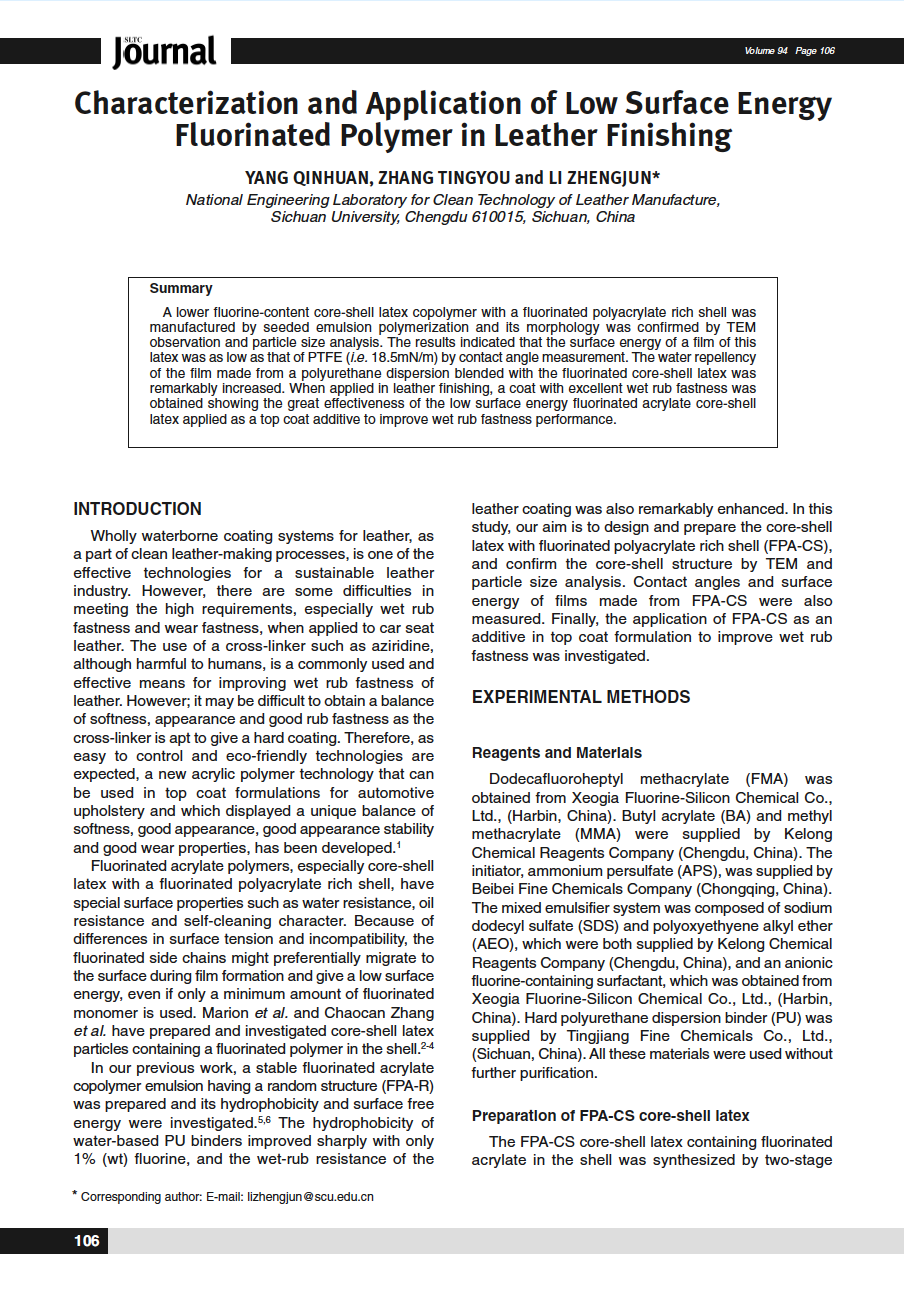 A lower fluorine-content core-shell latex copolymer with a fluorinated polyacrylate rich shell was manufactured by seeded emulsion polymerization and its morphology was confirmed by TEM observation and particle size analysis. The results indicated that the surface energy of a film of this latex was as low as that of PTFE (i.e. 18.5mN/m) by contact angle measurement. The water repellency of the film made from a polyurethane dispersion blended with the fluorinated core-shell latex was remarkably increased. When applied in leather finishing, a coat with excellent wet rub fastness was obtained showing the great effectiveness of the low surface energy fluorinated acrylate core-shell latex applied as a top coat additive to improve wet rub fastness performance.