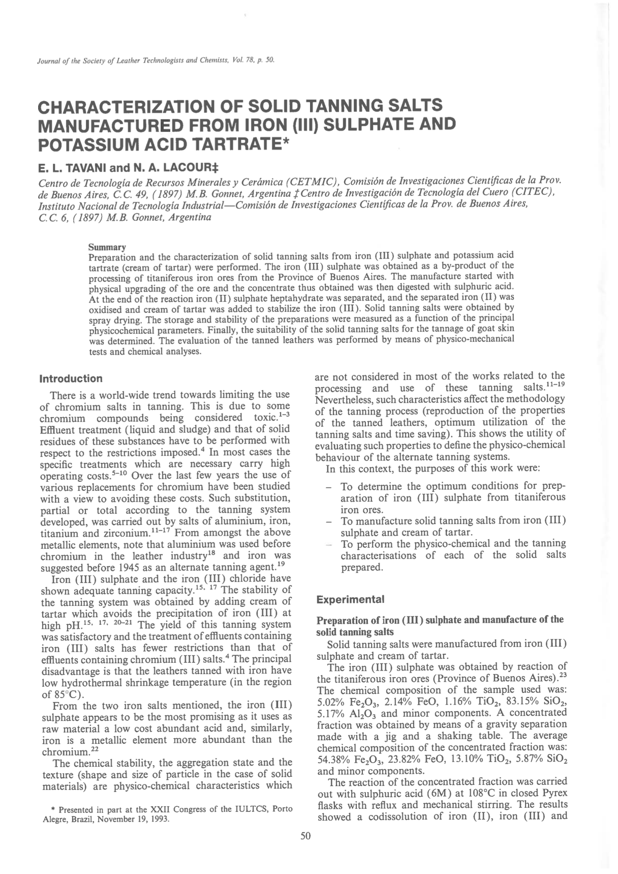 Preparation and the characterization of solid tanning salts from iron (III) sulphate and potassium acid tartrate (cream of tartar) were performed. The iron (III) sulphate was obtained as a by-product of the processing of titaniferous iron ores from the Province of Buenos Aires. The manufacture started with physical upgrading of the ore and the concentrate thus obtained was then digested with sulphuric acid. At the end of the reaction iron (II) sulphate heptahydrate was separated, and the separated iron (II) was oxidised and cream of tartar was added to stabilize the iron (III). Solid tanning salts were obtained by spray drying. The storage and stability of the preparations were measured as a function of the principal physicochemical parameters. Finally, the suitability of the solid tanning salts for the tannage of goat skin was determined. The evaluation of the tanned leathers was performed by means of physico-mechanical tests and chemical analyses.