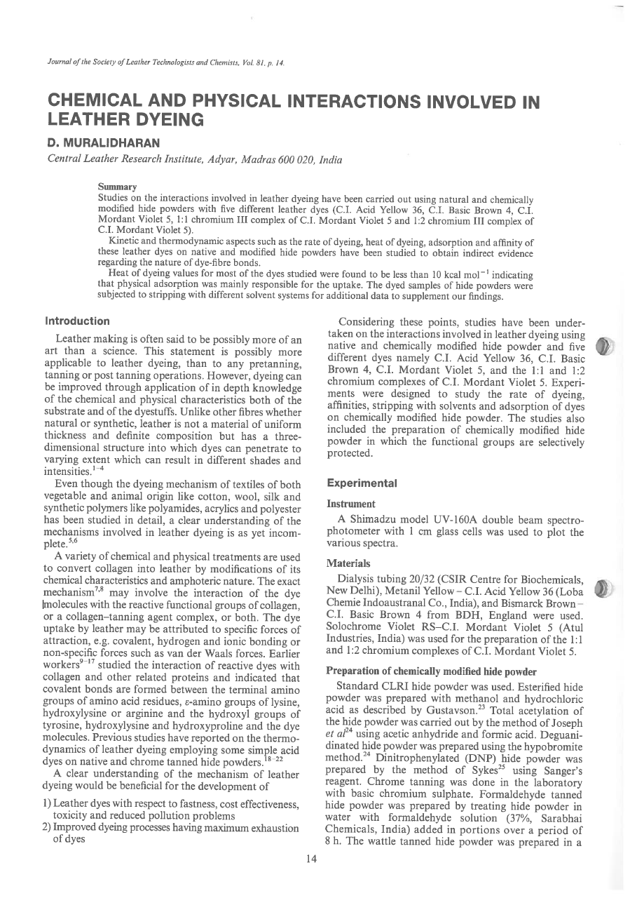 Studies on the interactions involved in leather dyeing have been carried out using natural and chemically modified hide powders with five different leather dyes (C.I. Acid Yellow 36, CI. Basic Brown 4, C.L Mordant Violet 5, 1:1 chromium III complex of C.I. Mordant Violet 5 and 1:2 chromium III complex of CI. Mordant Violet 5). Kinetic and thermodynamic aspects such as the rate of dyeing, heat of dyeing, adsorption and affinity of these leather dyes on native and modified hide powders have been studied to obtain indirect evidence regarding the nature of dye-fibre bonds. Heat of dyeing values for most of the dyes studied were found to be less than 10 kcal mol ‘indicating that physical adsorption was mainly responsible for the uptake. The dyed samples of hide powders were subjected to stripping with different solvent systems for additional data to supplement our findings.