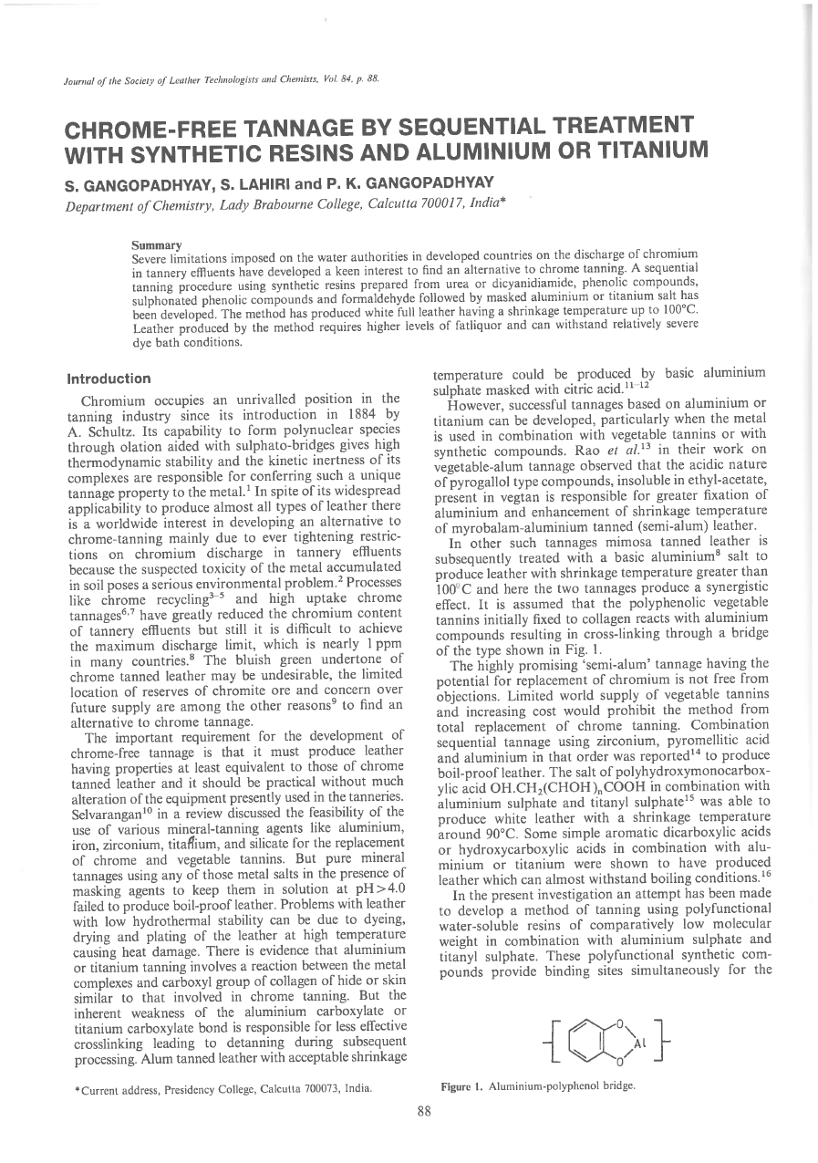 With strict discharge limits on chromium in tannery effluents, there is high interest in chrome alternatives. A sequential tanning procedure using synthetic resins (from urea or dicyanidiamide, phenolic compounds, sulphonated phenolic compounds, and formaldehyde) followed by masked aluminium or titanium salt has been developed. The method produces white full leather with shrinkage temperature up to 100°C. This leather needs more fatliquor but withstands severe dye bath conditions.
