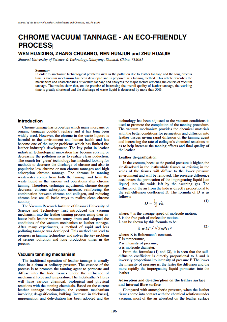 In order to ameliorate technological problems such as the pollution due to leather tannage and the long process time, a vacuum mechanism has been developed and is proposed as a tanning method. This article describes the mechanism and characteristics of vacuum tannage and analyzes the major factors affecting the course of vacuum tannage. The results show that, on the premise of increasing the overall quality of leather tannage, the working time is greatly shortened and the discharge of waste liquid is decreased by more than 50%.