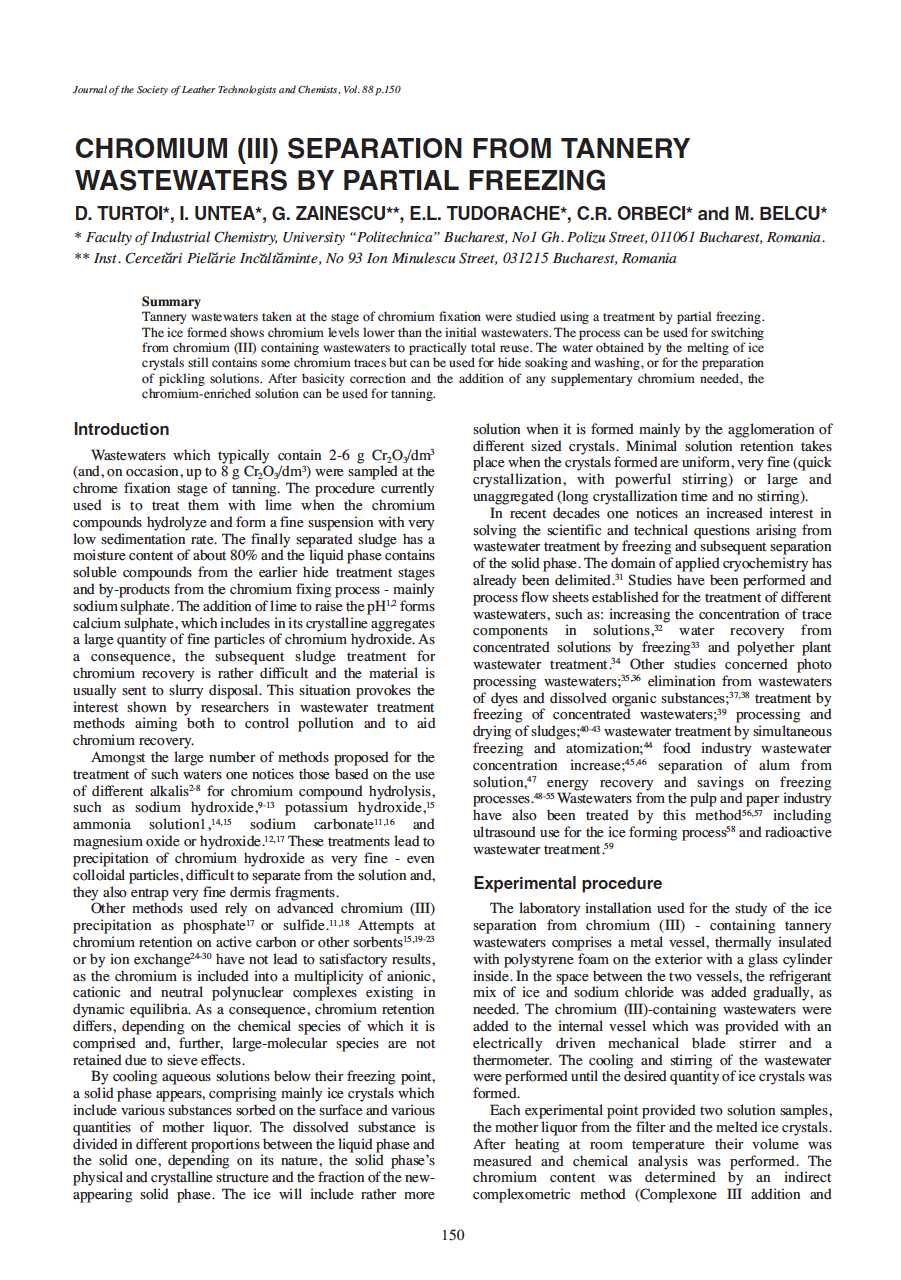Tannery wastewaters taken at the stage of chromium fixation were studied using a treatment by partial freezing. The ice formed shows chromium levels lower than the initial wastewaters. The process can be used for switching from chromium (III) containing wastewaters to practically total reuse. The water obtained by the melting of ice crystals still contains some chromium traces but can be used for hide soaking and washing, or for the preparation of pickling solutions. After basicity correction and the addition of any supplementary chromium needed, the chromium-enriched solution can be used for tanning.