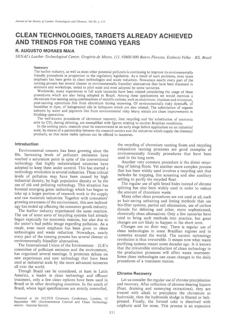 The leather industry, as well as most other potential polluters is continuing to improve its environmentally friendly procedures in proportion to the regulatory legislation. As a result of such problems, even more emphasis has been given to clean technologies and waste reduction. Nowadays nearly every part of the tanning process has several cleaner or environmentally friendlier alternatives that have been discussed in seminars and workshops, tested in pilot scale and even adopted by some tanneries. Worldwide, many experiences in full scale tanneries have been related considering the usage of these procedures which are also being adopted in Brazil. Among these applications we would mention a chromium-free tanning using combinations of metallic cations, such as aluminium, titanium and zirconium, post-tanning operations free from chromium during retanning. Of environmentally risky dyestuffs, of benzidine in dyes, of halogenated oils in fatliquors which are also related. The substitution of organic solvents by water and pigments free from environmental risky heavy metals are clean improvements in finishing operations. The well-known procedures of chromium recovery, lime recycling and the substitution of ammonia salts by CO2during deliming, are exemplified with figures relating to current Brazilian conditions. In the coming years, research must be concentrated at an early stage before application on an industrial scale, by means of a partnership between the research centers and the industries which supply the chemical products, so that more viable options can be offered to tanneries