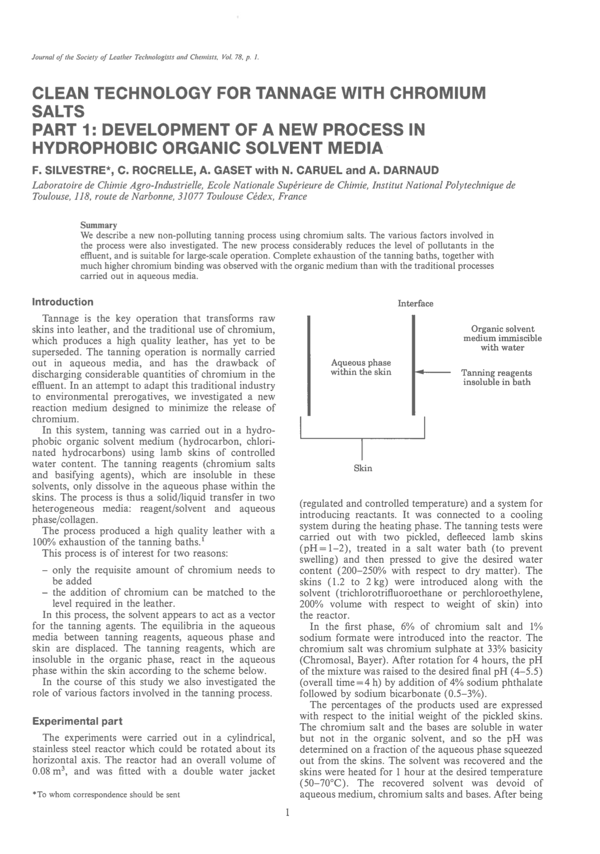 We describe a new non-polluting tanning process using chromium salts. The various factors involved in the process were also investigated. The new process considerably reduces the level of pollutants in the effluent, and is suitable for large-scale operation. Complete exhaustion of the tanning baths, together with much higher chromium binding was observed with the organic medium than with the traditional processes carried out in aqueous media.