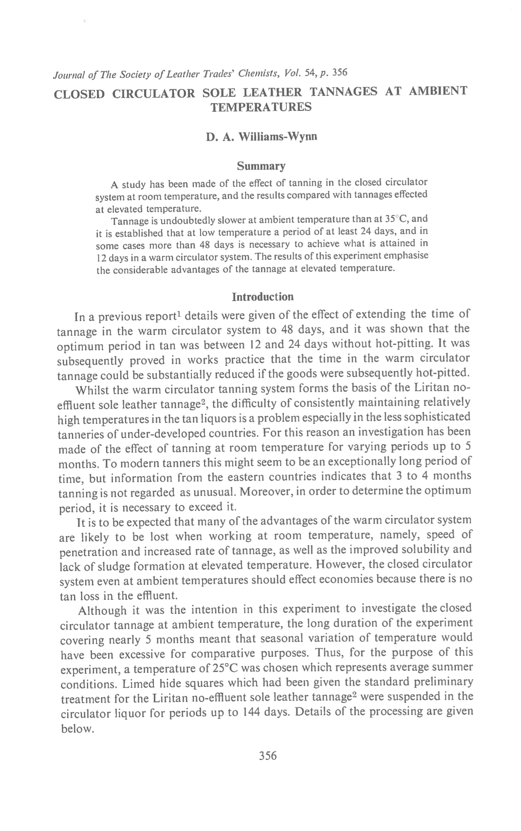 A study has been made of the effect of tanning in the closed circulator system at room temperature, and the results compared with tannages effected at elevated temperature. Tannage is undoubtedly slower at ambient temperature than at 35°C, and it is established that at low temperature a period of at least 24 days, and in some cases more than 48 days is necessary to achieve what is attained in 12 days in a warm circulator system. The results of this experiment emphasise the considerable advantages of the tannage at elevated temperature.
