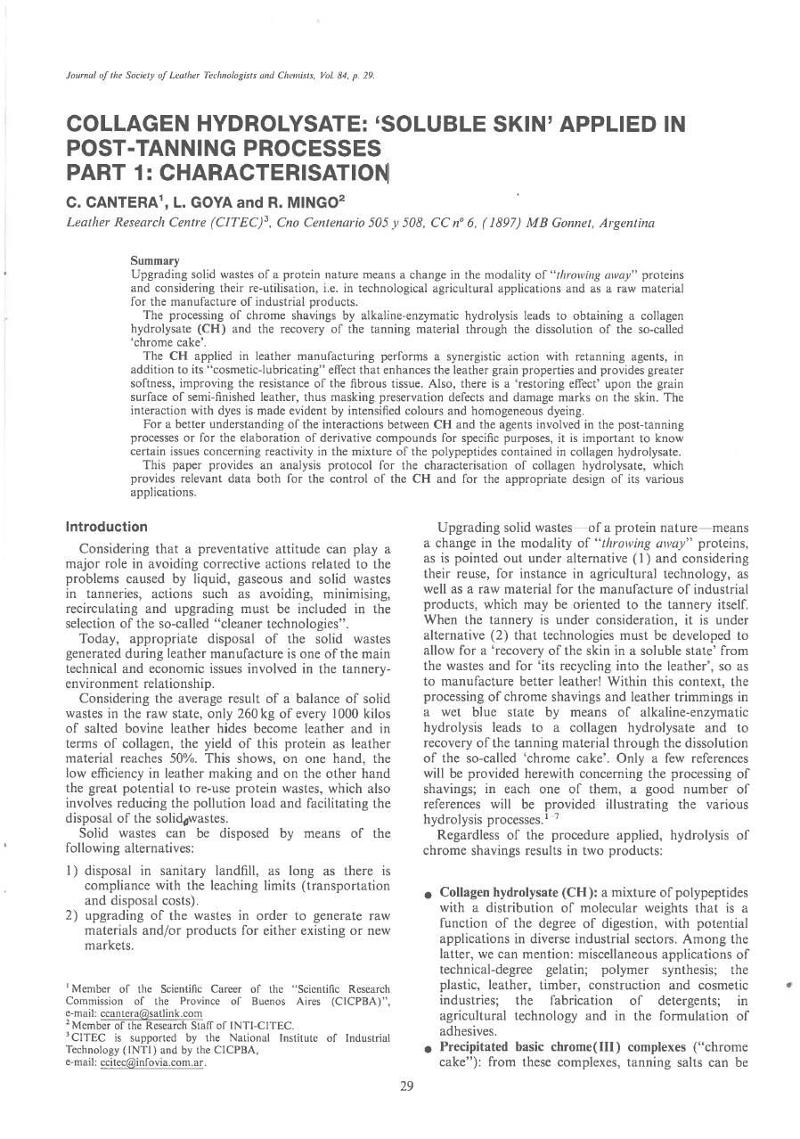 Collagen Hydrolysate: ‘Soluble Skin’ Applied In Post-Tanning Processes Part 1: Characterisation