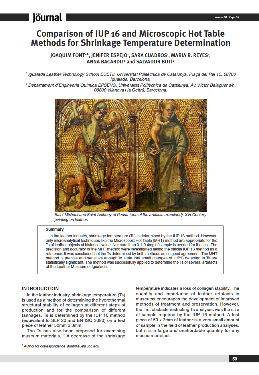 In the leather industry, shrinkage temperature (Ts) is determined by the IUP 16 method. However, only microanalytical techniques like the Microscopic Hot Table (MHT) method are appropriate for the Ts of leather objects of historical value. No more than 0.1-0.4mg of sample is needed for the test. The precision and accuracy of the MHT method were investigated taking the official IUP 16 method as a reference. It was concluded that the Ts determined by both methods are in good agreement. The MHT method is precise and sensitive enough to state that small changes of 1.3°C detected in Ts are statistically significant. The method was successfully applied to determine the Ts of several artefacts of the Leather Museum of Igualada.