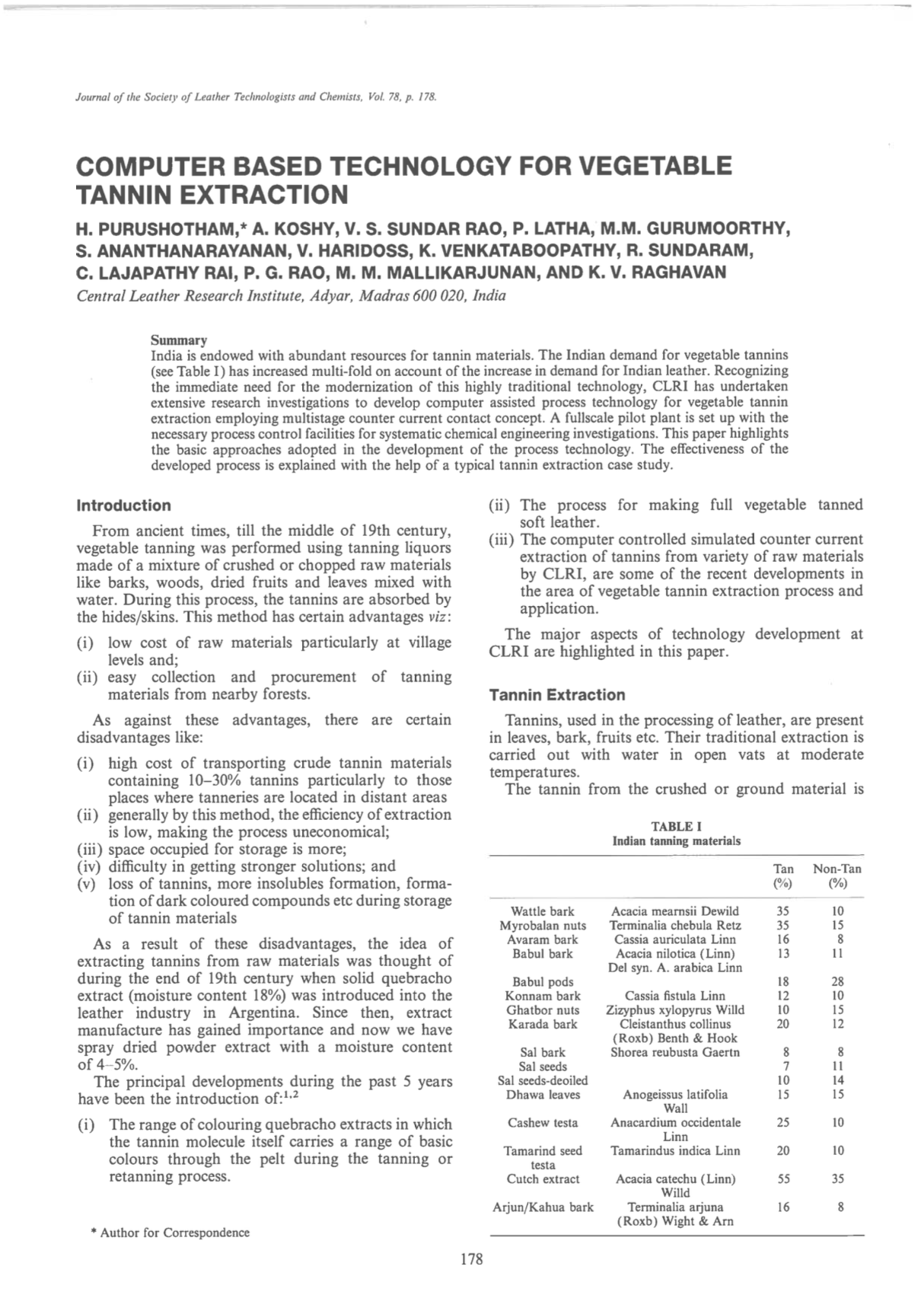 India is endowed with abundant resources for tannin materials. The Indian demand for vegetable tannins (see Table I) has increased multi-fold on account of the increase in demand for Indian leather. Recognizing the immediate need for the modernization of this highly traditional technology, CLRI has undertaken extensive research investigations to develop computer assisted process technology for vegetable tannin extraction employing multistage counter current contact concept. A fullscale pilot plant is set up with the necessary process control facilities for systematic chemical engineering investigations. This paper highlights the basic approaches adopted in the development of the process technology. The effectiveness of the developed process is explained with the help of a typical tannin extraction case study.