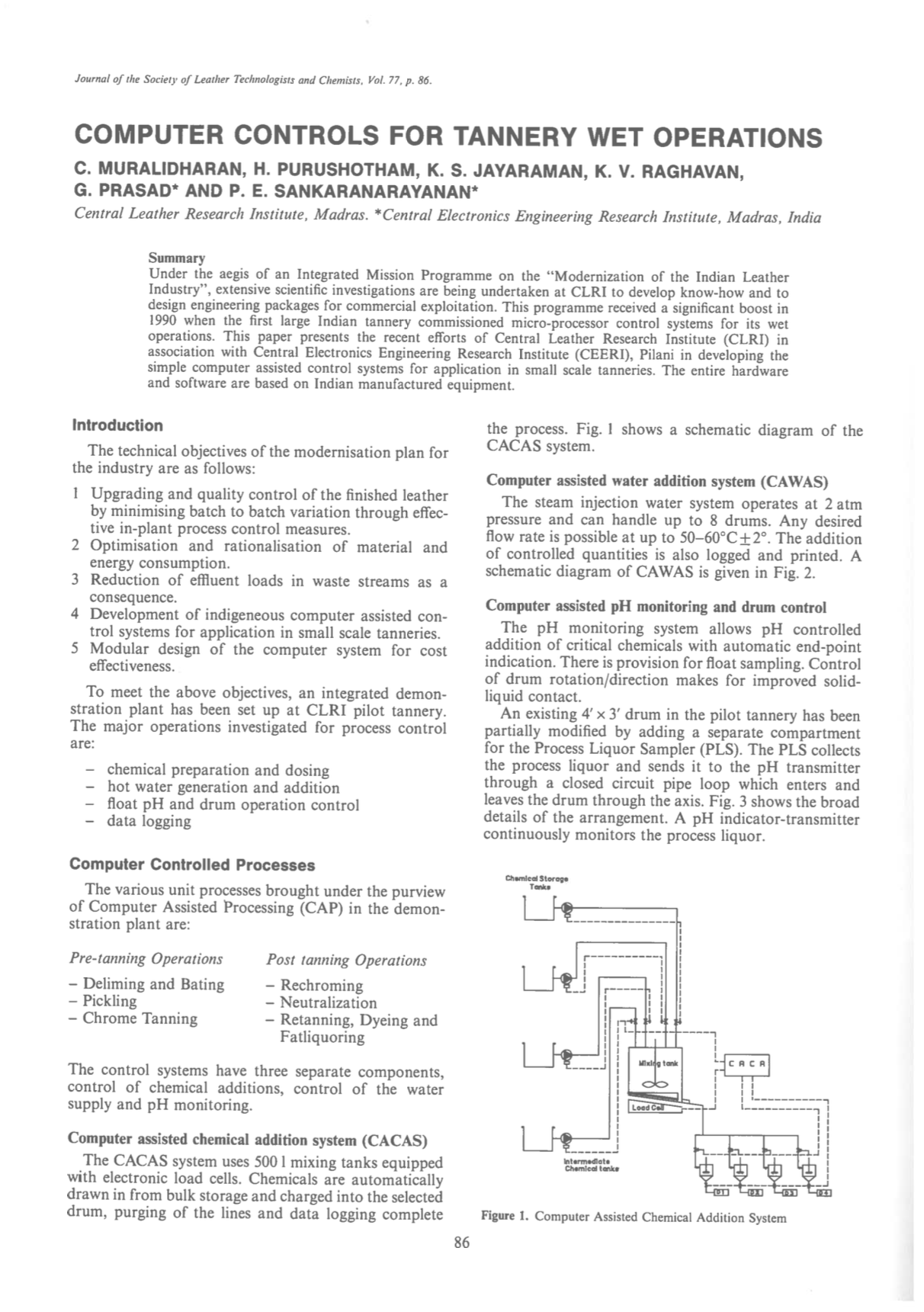 Under the aegis of an Integrated Mission Programme on the “Modernization of the Indian Leather Industry,” extensive scientific investigations are being undertaken at CLRI to develop know-how and to design engineering packages for commercial exploitation. This programme received a significant boost in 1990 when the first large Indian tannery commissioned micro-processor control systems for its wet operations. This paper presents the recent efforts of Central Leather Research Institute (CLRI) in association with Central Electronics Engineering Research Institute (CEERI), Pilani in developing the simple computer assisted control systems for application in small scale tanneries. The entire hardware and software are based on Indian manufactured equipment.
